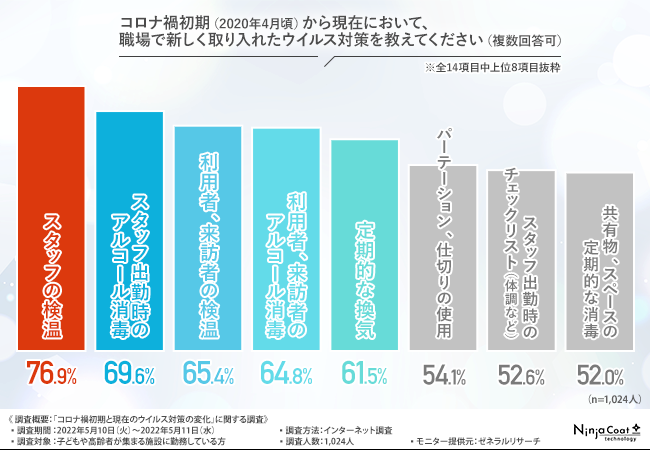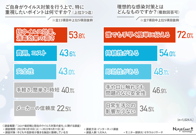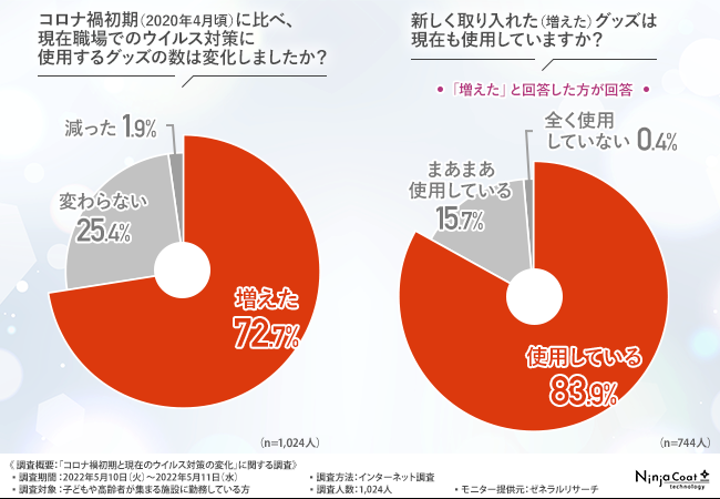 そこで今回、自分でできる本格抗ウイルスコート『Ninja Coat』(https://ninjacoat.jp)の製造・販売を手がける株式会社ワカヤマは、子どもや高齢者が集まる施設に勤務している方を対象に、「コロナ禍初期と現在のウイルス対策の変化」に関する調査を実施しました。
