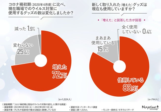 そこで、「コロナ禍初期(2020年4月頃)に比べ、現在職場でのウイルス対策に使用するグッズの数は変化しましたか?」と質問したところ、7割以上の方が『増えた(72.7%)』と回答しました。