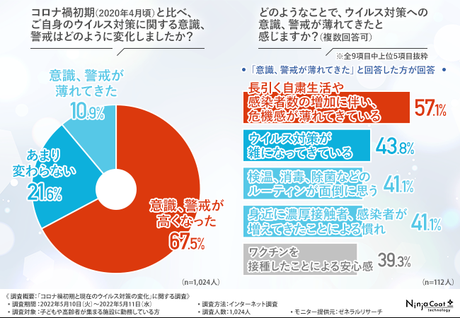 「コロナ禍初期(2020年4月頃)と比べ、ご自身のウイルス対策に関する意識、警戒はどのように変化しましたか?」と質問したところ、『意識、警戒が高くなった(67.5%)』『あまり変わらない(21.6%)』『意識、警戒が薄れてきた(10.9%)』という結果になりました。