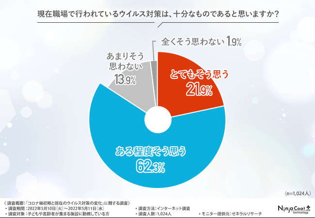 そこで、「現在職場で行われているウイルス対策は、十分なものであると思いますか?」と質問したところ、約8割の方が『とてもそう思う(21.9%)』『ある程度そう思う(62.3%)』と回答しました。