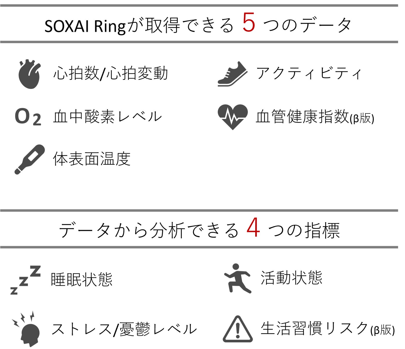 SOXAI Ringは、心拍数や血中酸素レベル等のバイタルデータを正確に取得・分析可能な、睡眠分析・コンディション管理用の指輪型IoTデバイス(スマートリング)です。日本人の指に合うスマートリングとして究極のミニマルデザインを追求し、ファッションリングとしてはもちろんのこと、運動・仕事・睡眠中など普段の生活においてもシーンを問わず24時間自然に着用することができるようデザインされています。