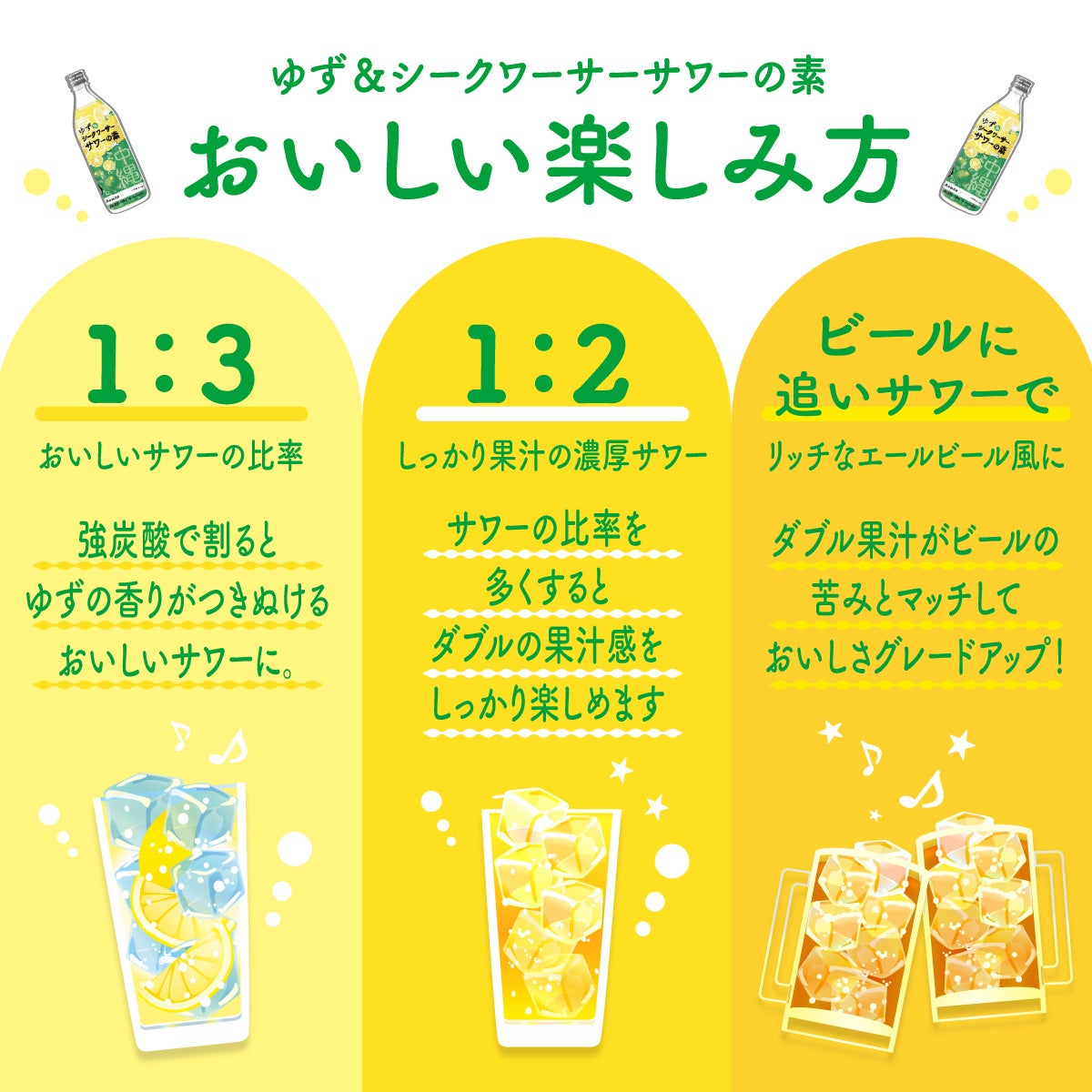 1:3(=サワーの素:炭酸水)で割れば、華やかなゆずの香りが広がる、アルコール度数約5%のおいしいサワーができあがり。