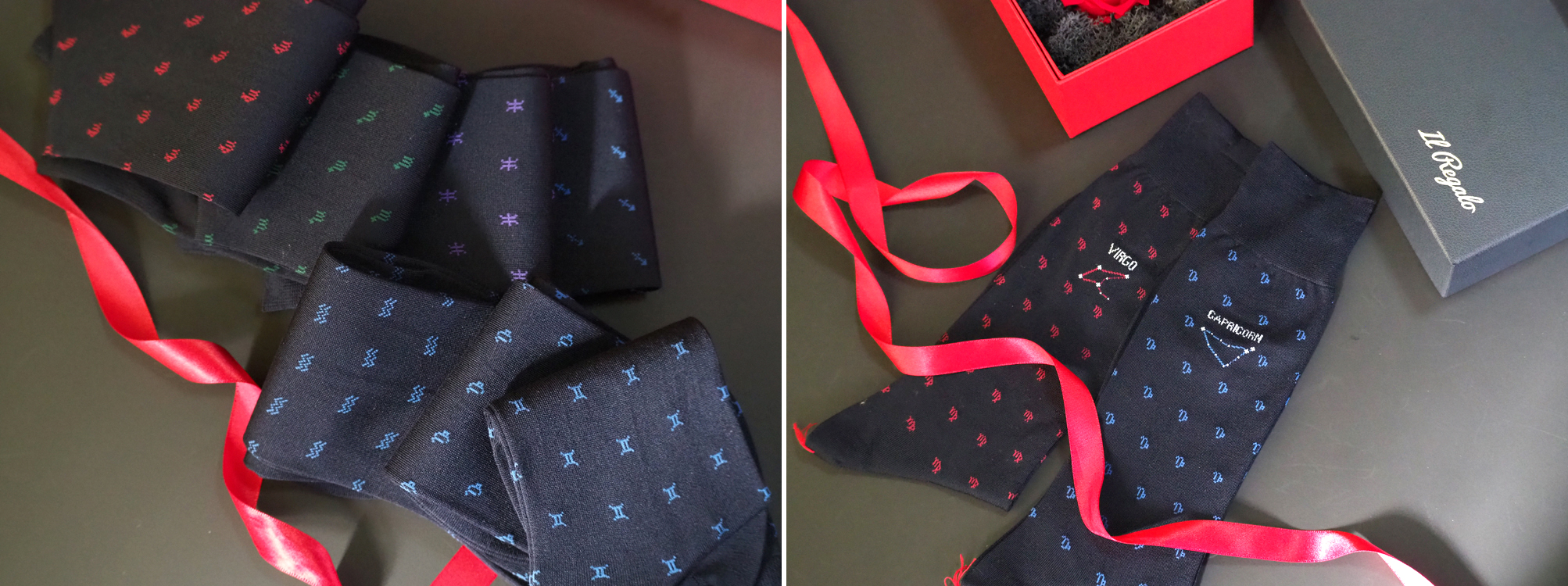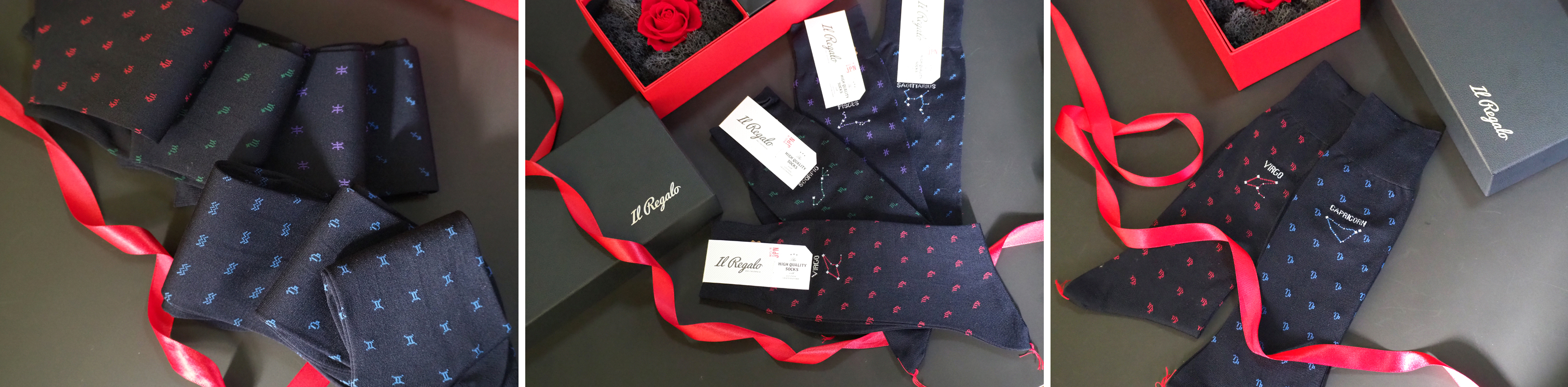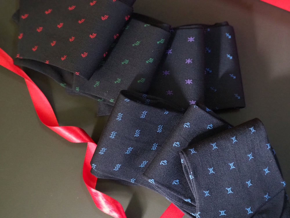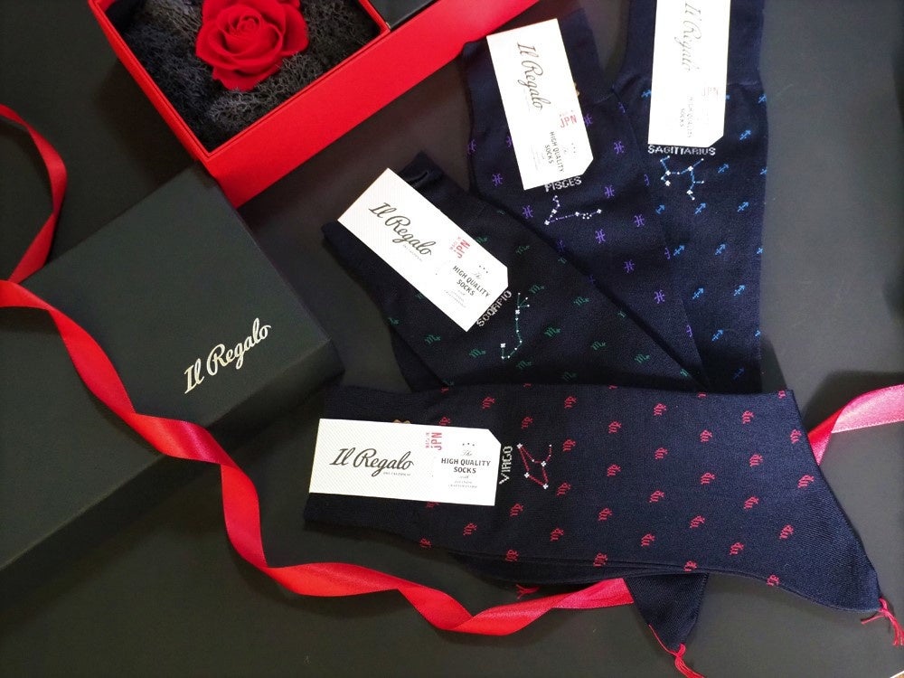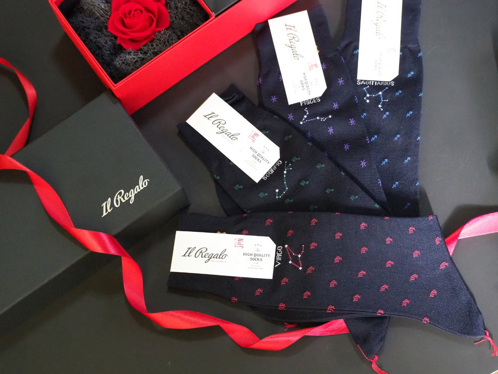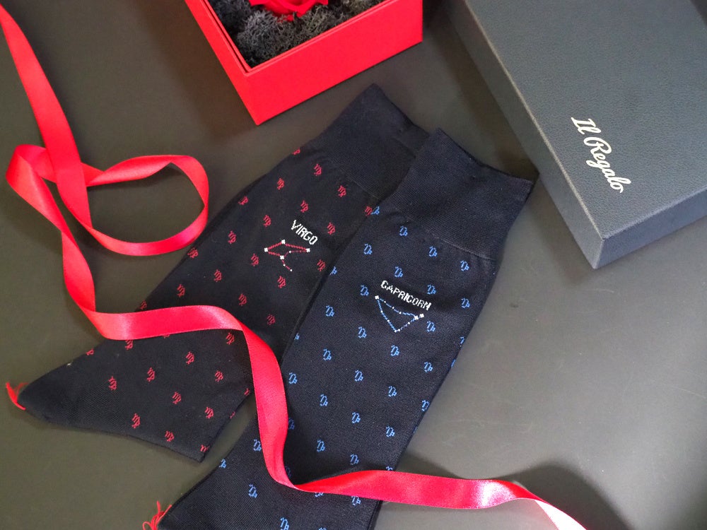 イルレガロの靴下は12星座それぞれにラテン語で星座名が編み込まれており、各星座のシンボルが靴下全体に散りばめられています。星座を形作っている星々にはラメ糸を使用していて星が輝いている様が表現されています。靴下本体の素材はイタリアから取り寄せた高級綿糸で、夜空を連想させる深みのある紺色を採用しています。細部までこだわり抜いたまさに「オシャレは足元から」という言葉がピッタリの靴下です。(贈るお相手の星座をお選び頂けます。)