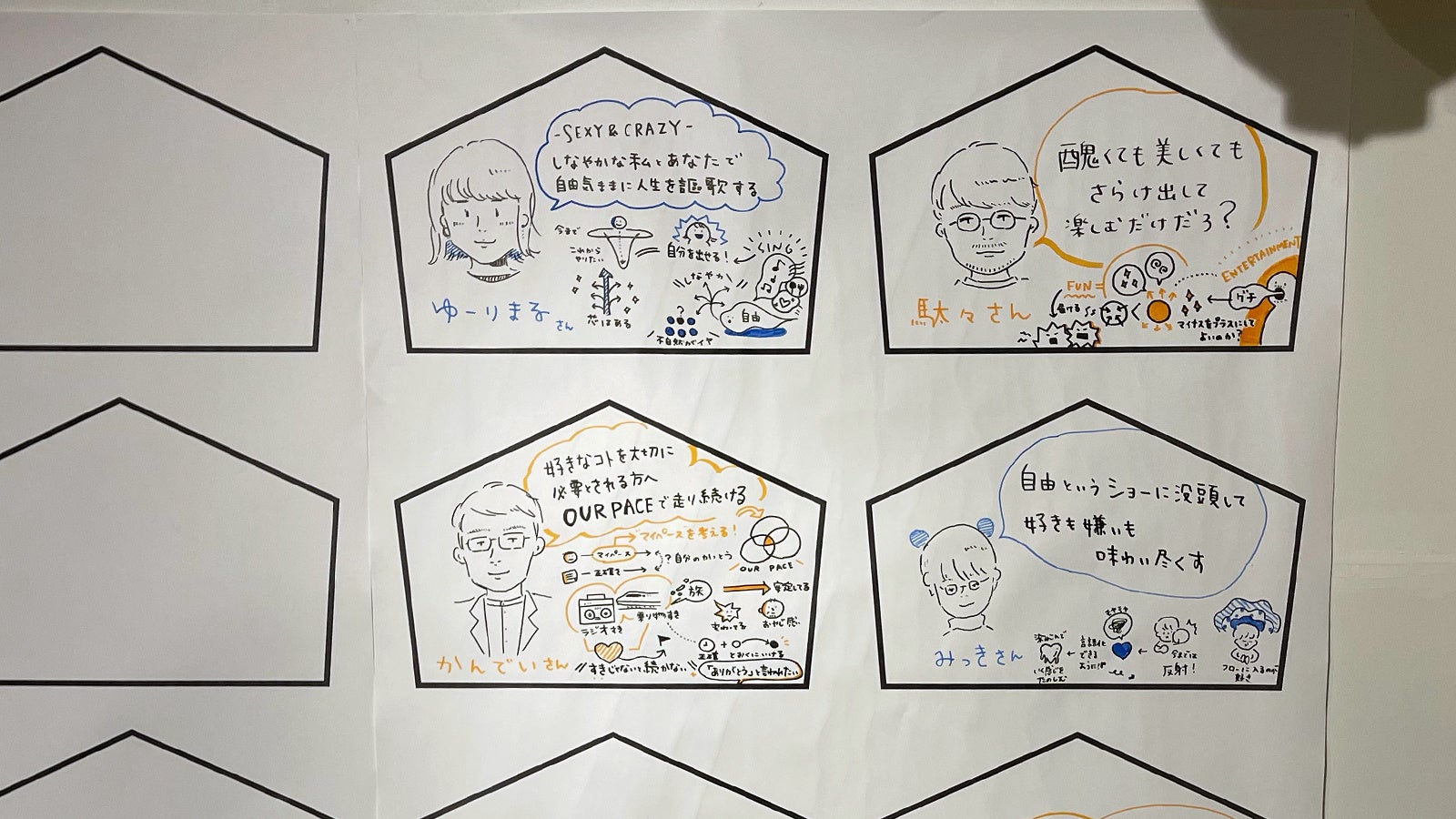 個人理念を言語化する過程の対話の内容をグラフィックレコーディングという手法でイラスト(絵馬)にします。 (1月5.8.9.14日 各18〜22時のみ)