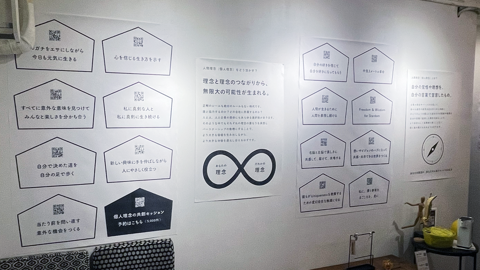 これまでに共創させていただいた「個人理念」の一部を展示しています。併記したQRコードからは、ひとりひとりの活動内容や理念が共創されるプロセスを閲覧することができます。