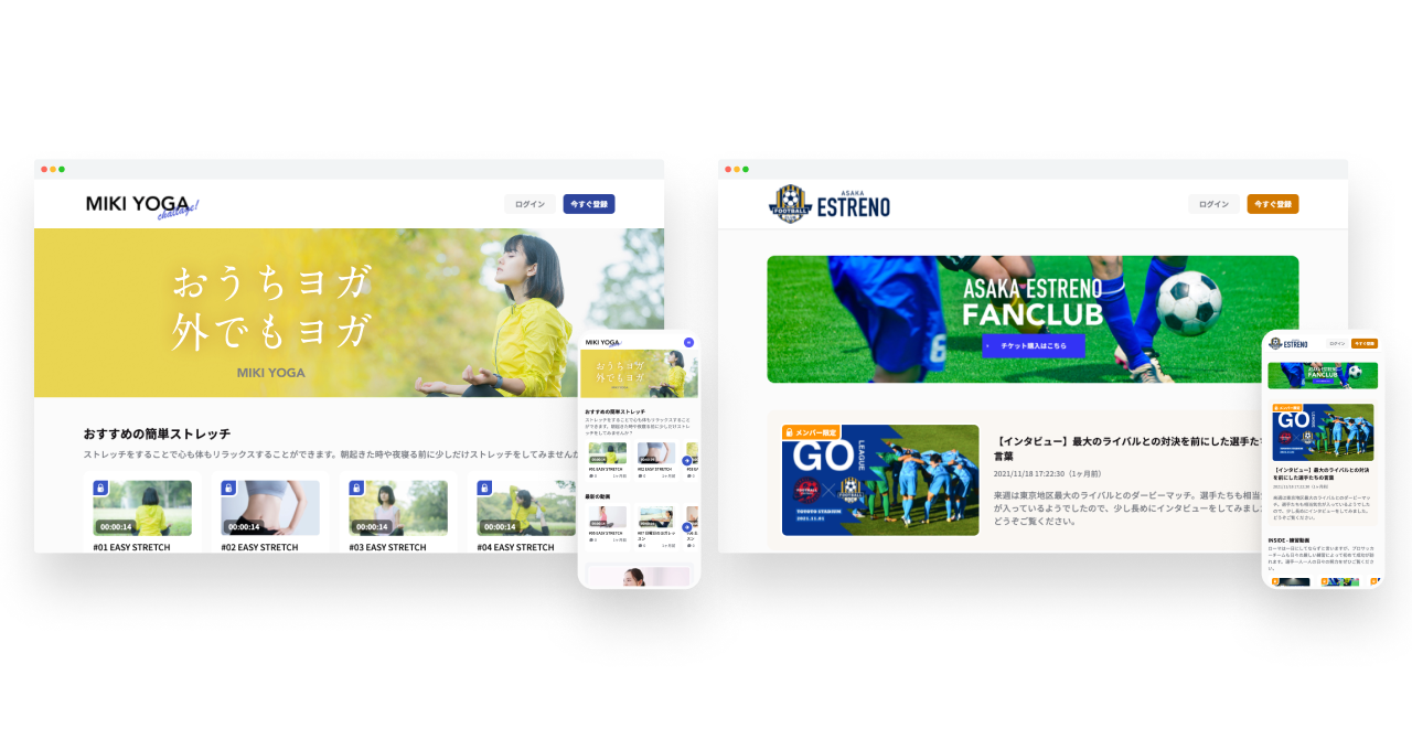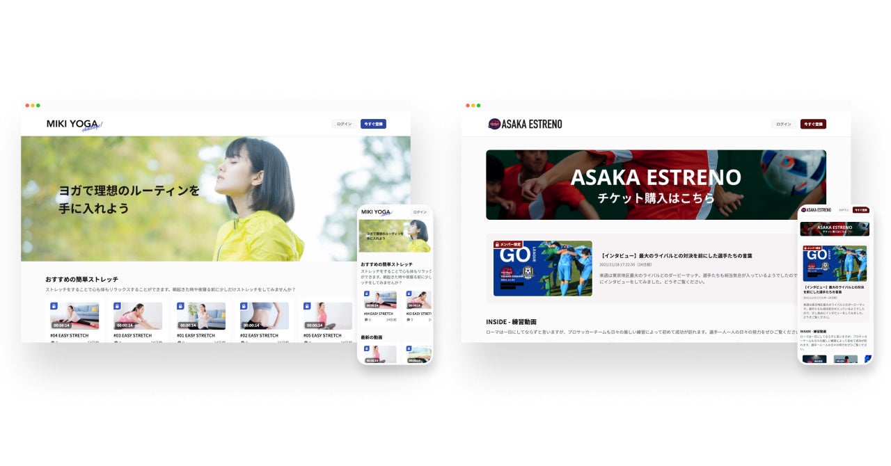 YouTubeで活動している方が独自で月額会員動画サイトを運営したい、動画中心のオンラインサロンを作りたい、ヨガやフィットネスのオンラインスクールを作りたい、プロスポーツチームやアーティストでファン向けに動画を発信していきたいなど、さまざまな方の多様なニーズに応えます。