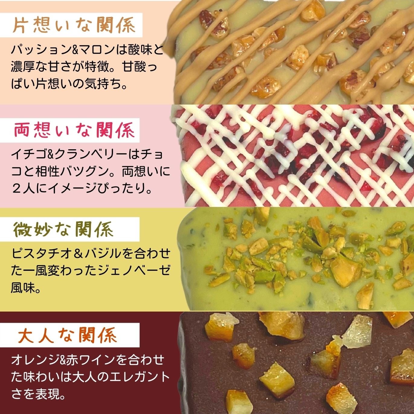 友チョコから本命まで想いに合わせたフレーバーのチョコレートを期間限定販売。チョコレートの新たな相性を探求する「チョコレートな関係」(宮城県仙台市:株式会社イノベーションスイーツ)が贈る4種の関係。