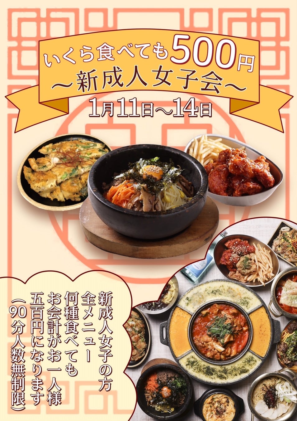 2022年1月11日~14日の4日間限定!新成人の女性グループは何を食べてもお一人様お会計500円+税!