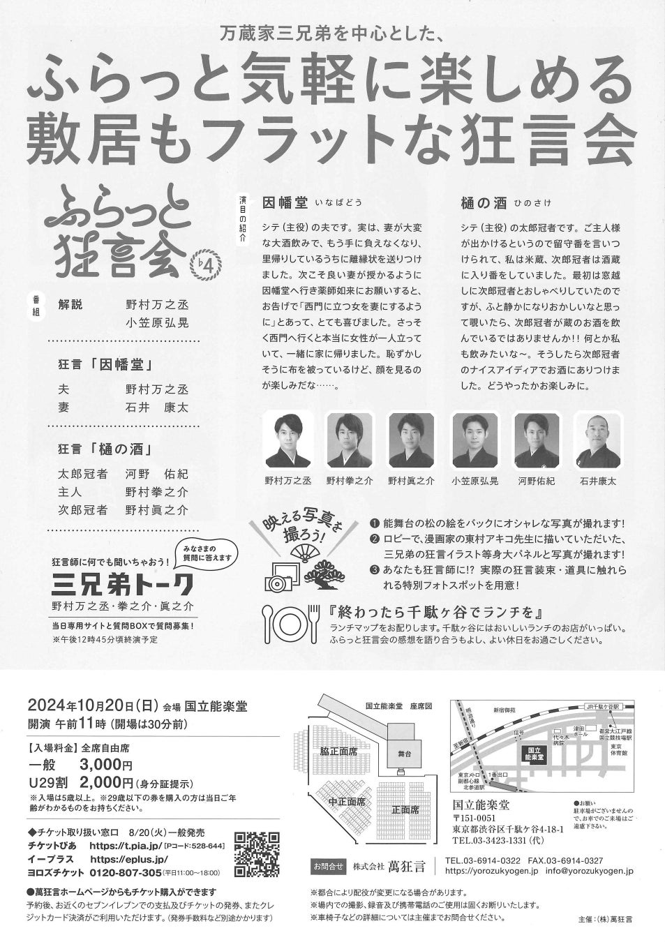 株式会社萬狂言は、日本の伝統芸能である狂言に普段馴染みのない方々や若い人達に、“ふらっと”気軽に観にきて楽しんでもらうため、野村万蔵家の若手狂言師の三兄弟、野村万之丞、拳之介、眞之介を中心に、10月20日(日)11時より国立能楽堂にて『ふらっと狂言会♭4』を開催します。チケットは、本日8月20日(火)よりチケットぴあ、イープラス、萬狂言にて発売を開始します。