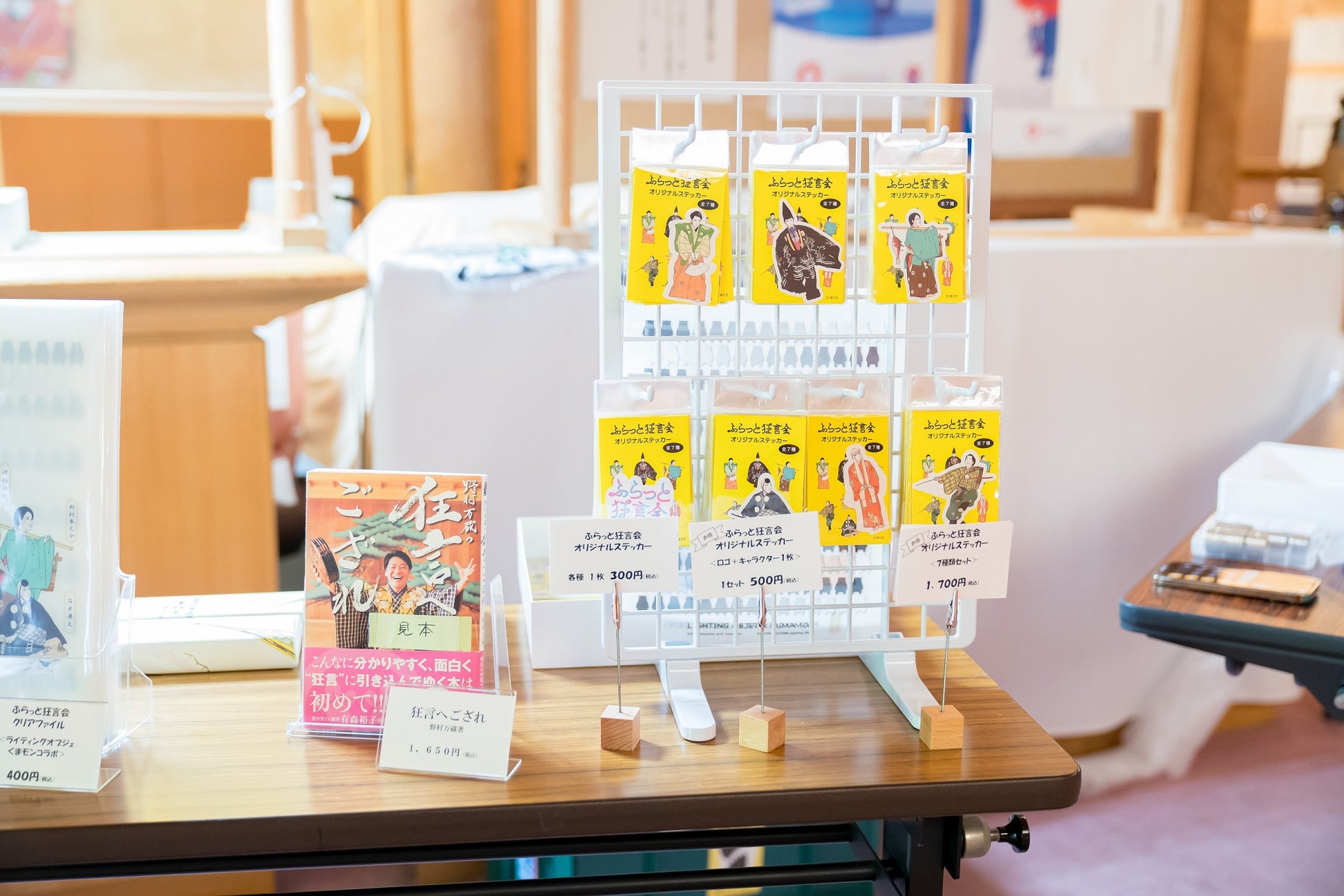 また、本公演のために漫画家・東村アキコ先生に描き下ろしていただいた『ふらっと狂言会』出演メンバーのイラストを使用した記念撮影用パネルをロビーに設置し、フォトスポットとして人気を博しています。第三回からは本公演オリジナルとなる、ステッカーを製作し販売も行っています。