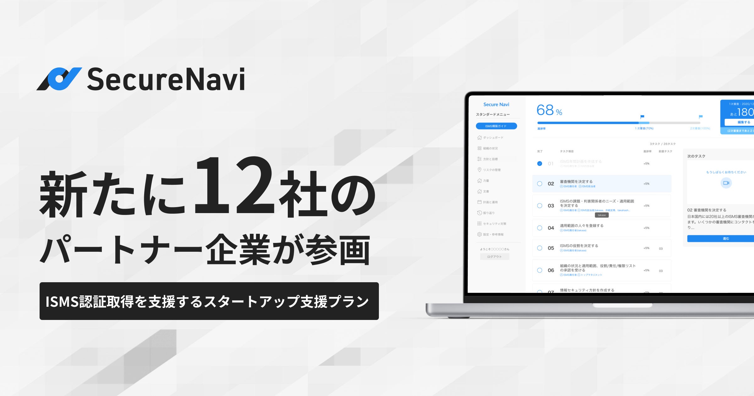 ISMSオートメーションツール SecureNavi、スタートアップのISMS認証取得を支援する「スタートアップ支援プラン」に、新たに12社のパートナー企業が参画
