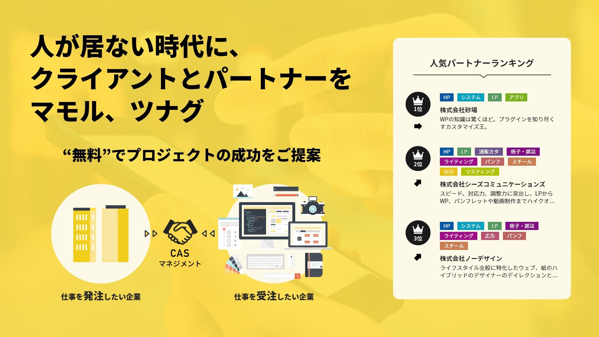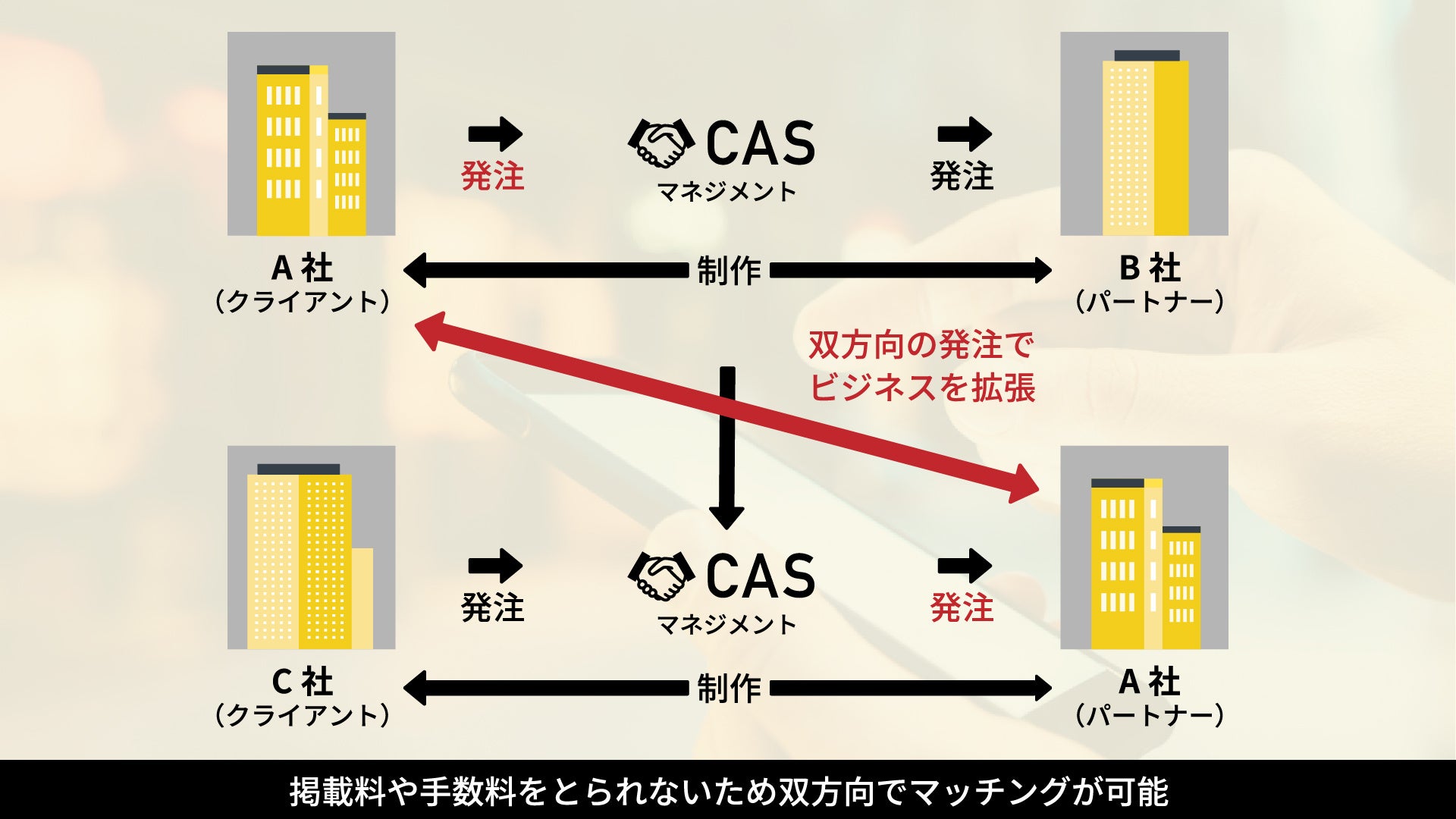 クライアントの立場では優秀なパートナーが無料で使え、パートナーの立場では仕事の依頼が増え、リソースや受注量を拡大したい場合にはCASのパートナーを無料で使えます。