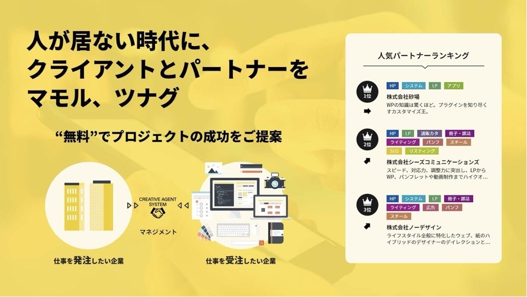 拡張型ビジネス。クリエイティブパートナーと発注者、双方“無料”で優秀なパートナー選びを実現。パートナー発掘から契約、納品まで一括マネジメントする新しいビジネスマッチングサービスが誕生。