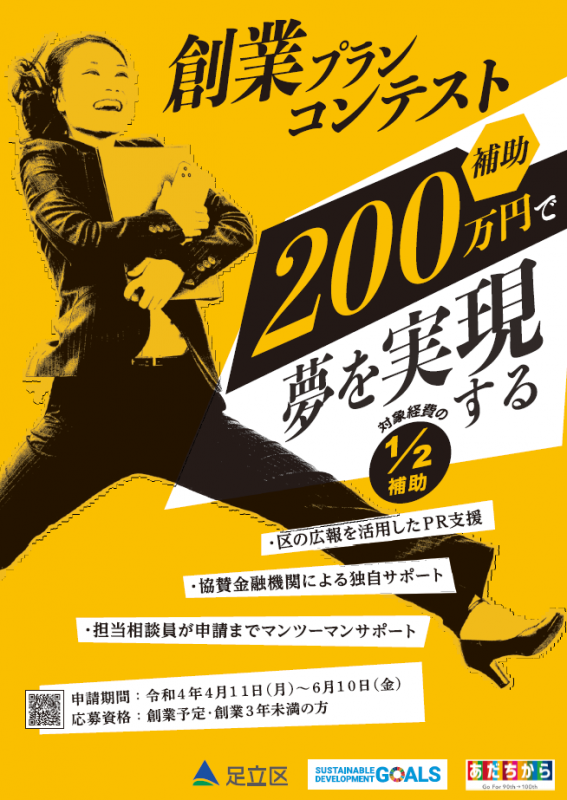 足立区では、斬新なアイデアをもって創業する事業家の方を応援するため、「創業プランコンテスト」を実施します。この事業は、区内産業の活性化を目的として、優秀かつ斬新なアイデアをもつ起業家から事業計画(ビジネスプラン)を募集し、審査の上、優秀な事業計画の提出者を表彰します。また、受賞者には、事業の実施状況を評価した上、補助金を交付します。(最優秀賞・優秀賞:最大200万円/奨励賞:50万円)