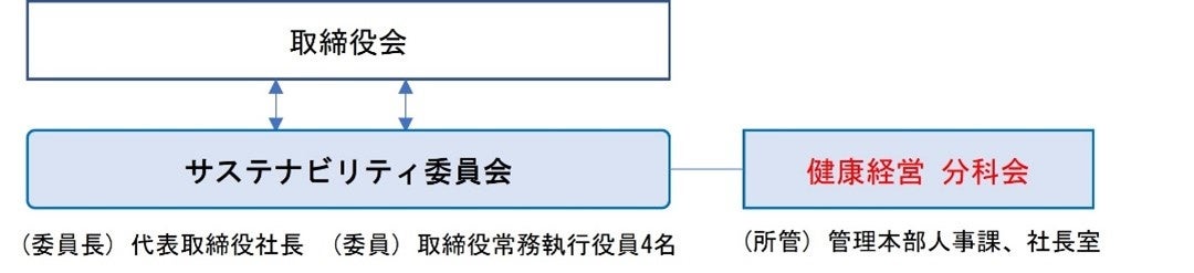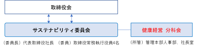 2022年2月に取締役会と連携した「サステナビリティ委員会」を発足し、同委員会内に健康経営の分科会を設置。人事課と社長室を中心とした推進体制を整備し、健康経営を推進いたします。