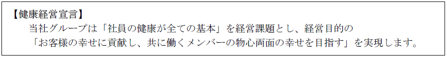 | 【健康経営宣言】 当社グループは「社員の健康が全ての基本」を経営課題とし、 経営目的の「お客様の幸せに貢献し、共に働くメンバーの物心両面の幸せを目指す」を実現します。 |