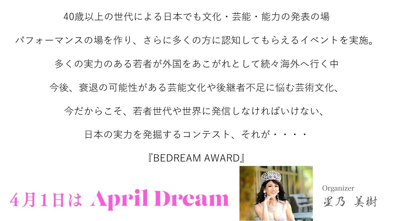 当社は、4月1日を夢を発信する日にしようとするApril Dreamに賛同しています。このプレスリリースは「BEDREAM AWARD」の夢です。