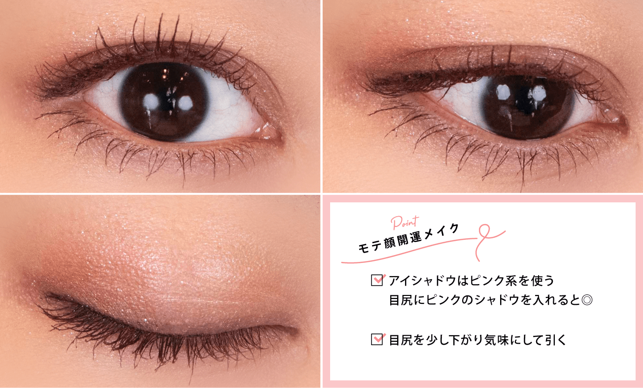 アイシャドウはピンク系を使いましょう。目尻にピンクのシャドウを入れるとさらに効果ありだそう。