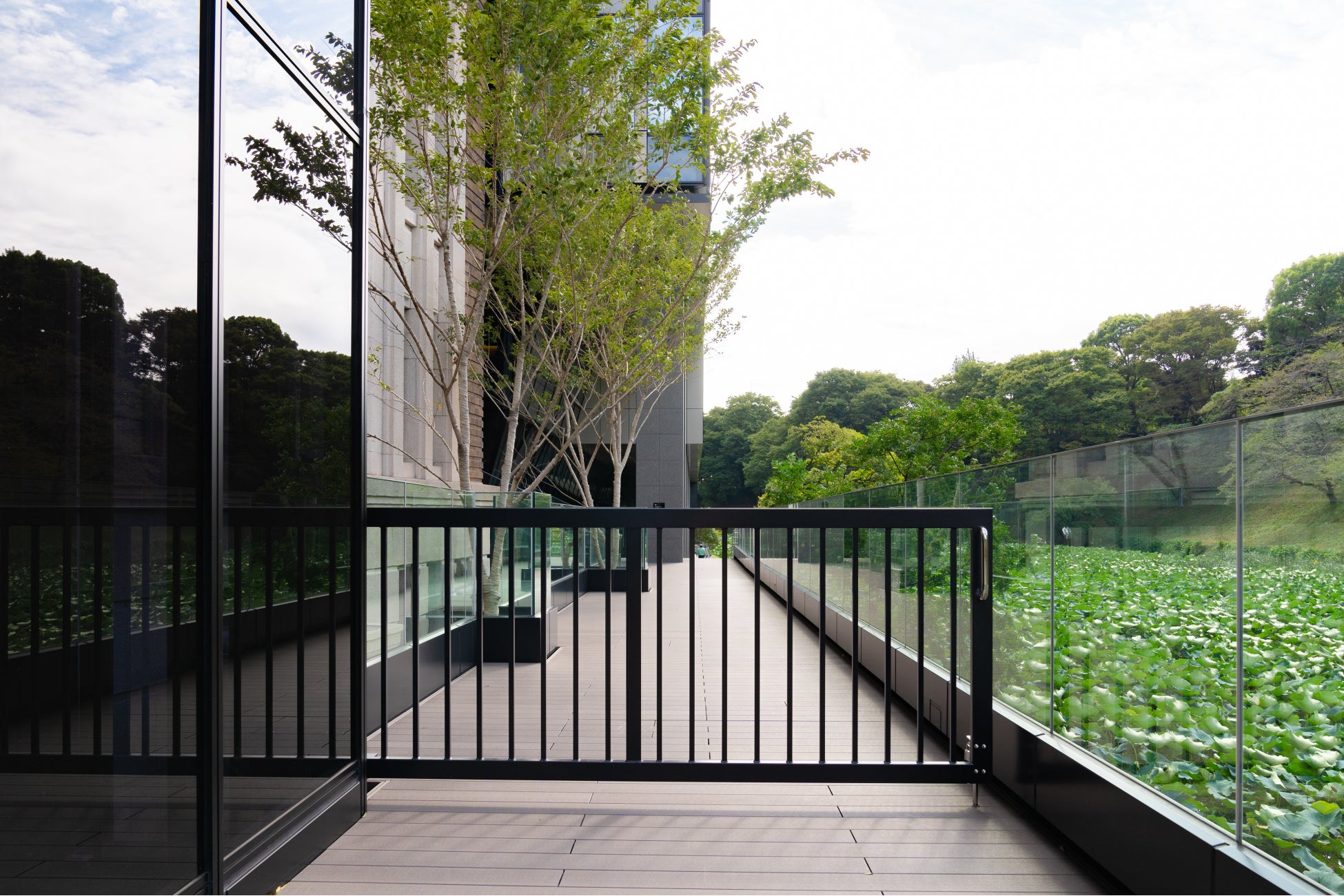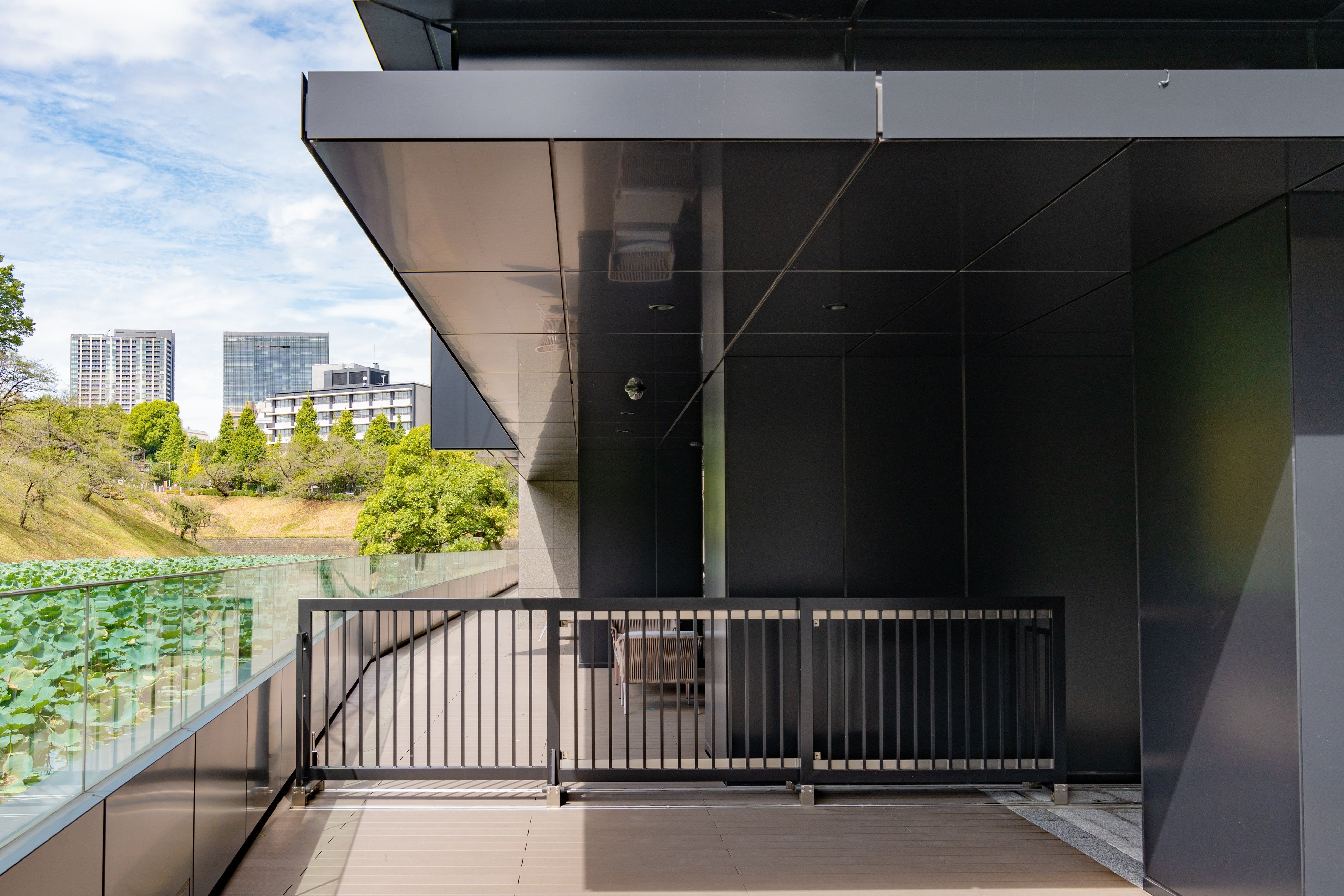 今回ヒガノが納入したゲートは、建物西側の皇居の濠沿いに作られた一般歩行者用のデッキ通路における、夜間のセキュリティ対策としての機能を担っています。