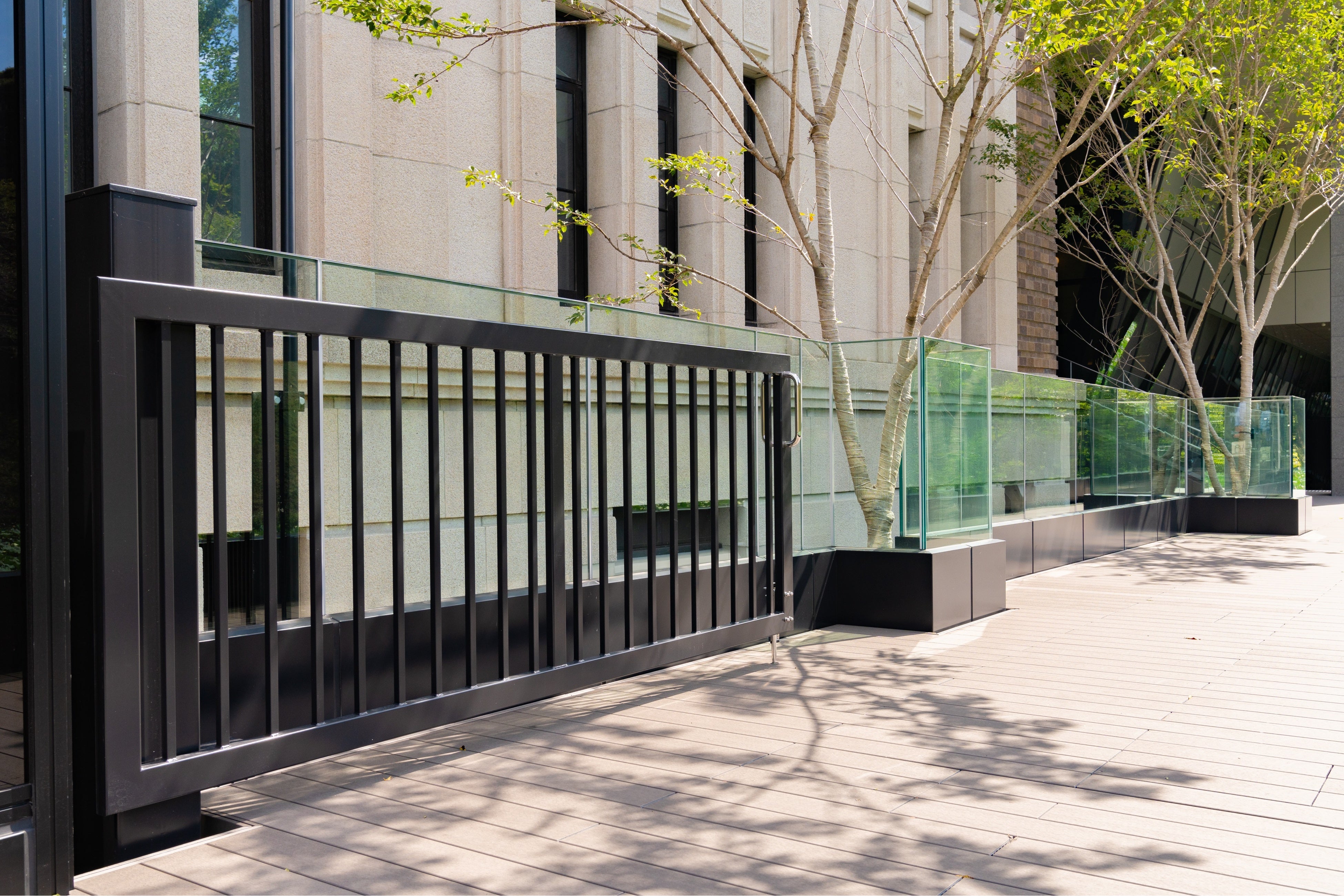 人が通行することが前提のため、ゲートが開いている状態でも違和感なく景観に溶け込む意匠となっている一方で、夜間にはデッキへの立ち入りを制限するセキュリティの機能を兼ね備えており、地域住民に安全な憩いの場を提供し、施設の価値を高める一助となっています。