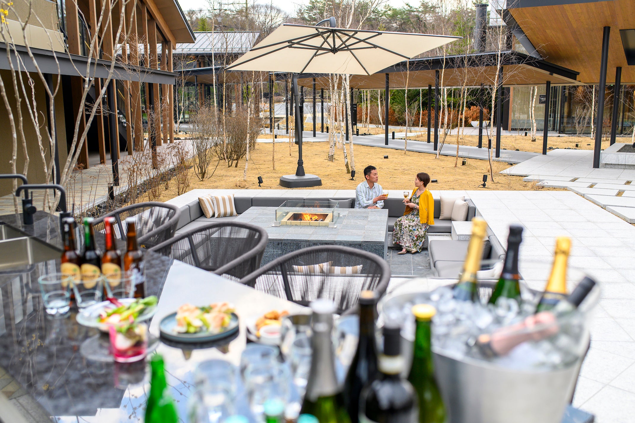 軽井沢の森をイメージした「フォレストガーデン」において、焚き火台の火の揺らぎを楽しみながら、信州のローカルビールやワイン、アペリティフを楽しんでいただける「焚き火ラウンジ」をオープンします。雪解けが進んだ雄大な浅間山を背景に、鳥のさえずりやガーデンの新緑を楽しみながら、春のアウトドアを気軽にお楽しみください。