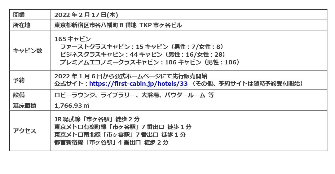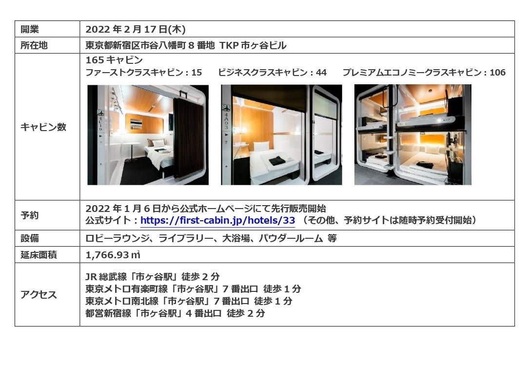 公式サイト:https://first-cabin.jp/hotels/33 (その他、予約サイトは随時予約受付開始)