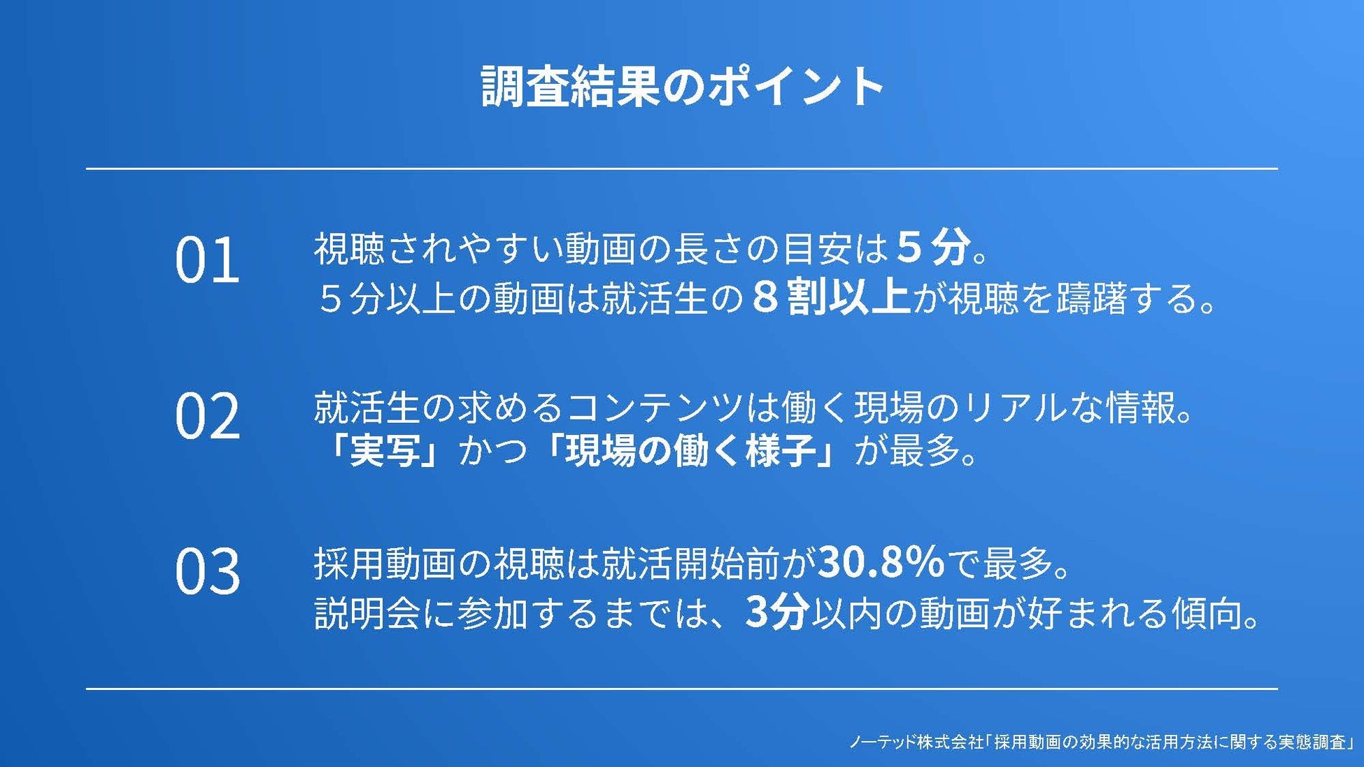 企業は、学生のニーズに応じた適切な長さの動画コンテンツを提供することで、学生に効果的にアピールすることができます。この調査を活用し、各企業が戦略的な採用動画制作を行い、採用活動における成功を目指していくことが求められます。