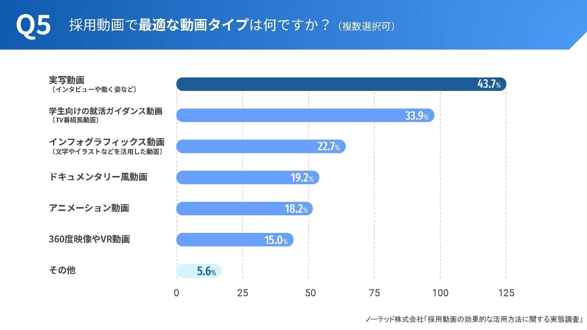 就活生が最適だと感じる動画タイプは、「実写動画(インタビューや働く姿など)」が43.7%、「学生向けの就活ガイダンス動画(TV番組風動画)」が33.9%、「インフォグラフィックス動画(文字やイラストなどを活用した動画)」が22.7%となっています。これらの動画タイプを取り入れることで、就活生に訴求力のある採用動画を制作することができます。