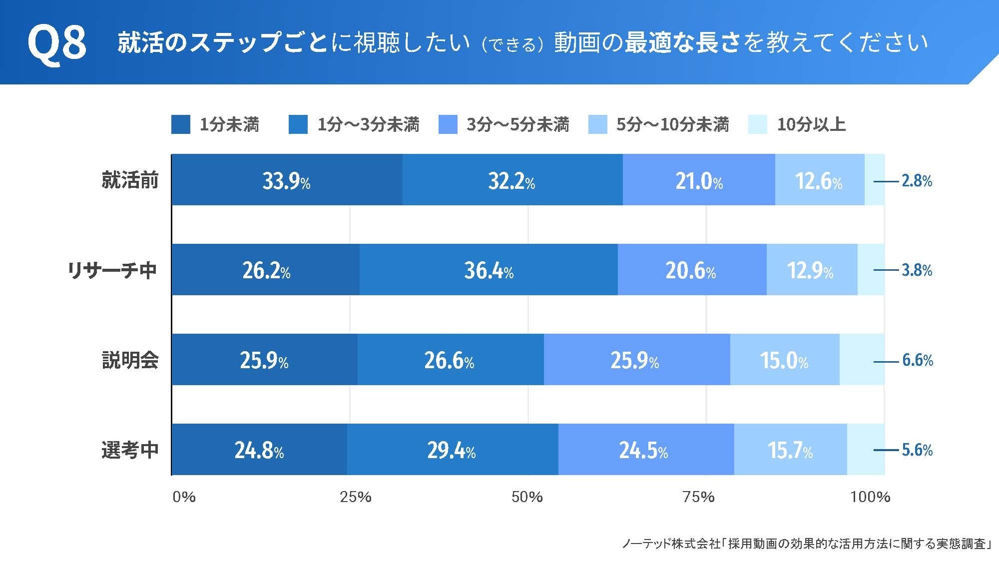 これらの結果から、就職活動の前半では短い動画が好まれ、後半に進むにつれて長めの動画も視聴される傾向があることがわかります。企業は、学生のニーズに応じて、適切な長さの動画コンテンツを提供することで、学生に効果的にアピールすることができます。