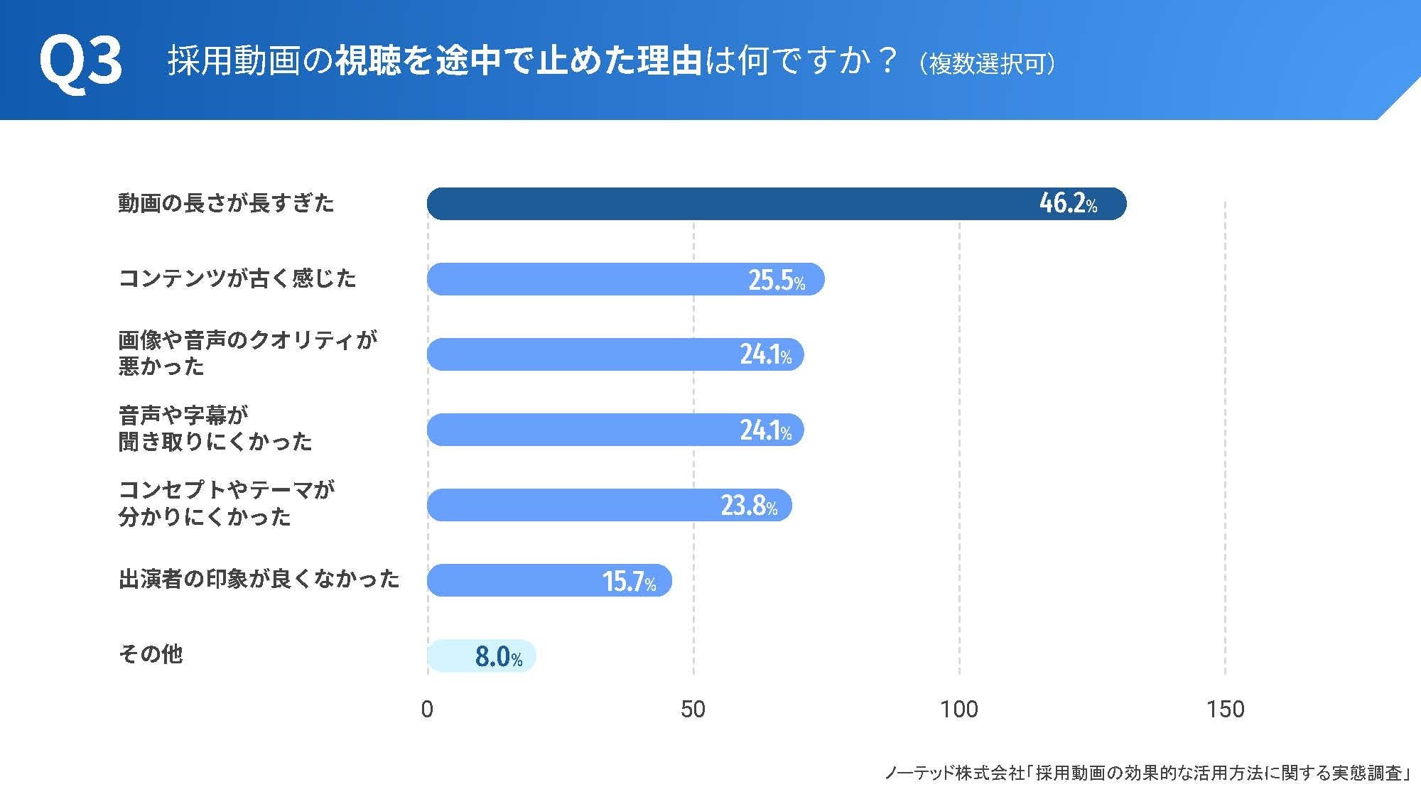 採用動画の視聴を途中で止めた理由として、「動画の長さが長すぎた」が46.2%と最も多く、その他にも「コンテンツが古く感じた」(25.5%)、「コンセプトやテーマが分かりにくかった」(23.8%)、「画像や音声のクオリティが悪かった」(24.1%)などの理由が挙げられています。これらの結果から、採用動画制作時には分かりやすさやクオリティにも注意が必要であることがわかります。