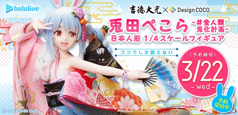 「兎田ぺこら -#全人類兎化計画- 日本人形 1/1等身大スケールフィギュア」および「兎田ぺこら -#全人類兎化計画- 日本人形 1/4スケールフィギュア」の彩色原型は、2023年1月2日(月)より、アニメイト秋葉原店に展示され1/4スケールフィギュアは2023年1月1日(日・祝)より、デザインココが運営する公式ECサイト『COCOストア』(https://coco-store.jp/)にて、2023年3月22日(水)まで予約が可能となります。