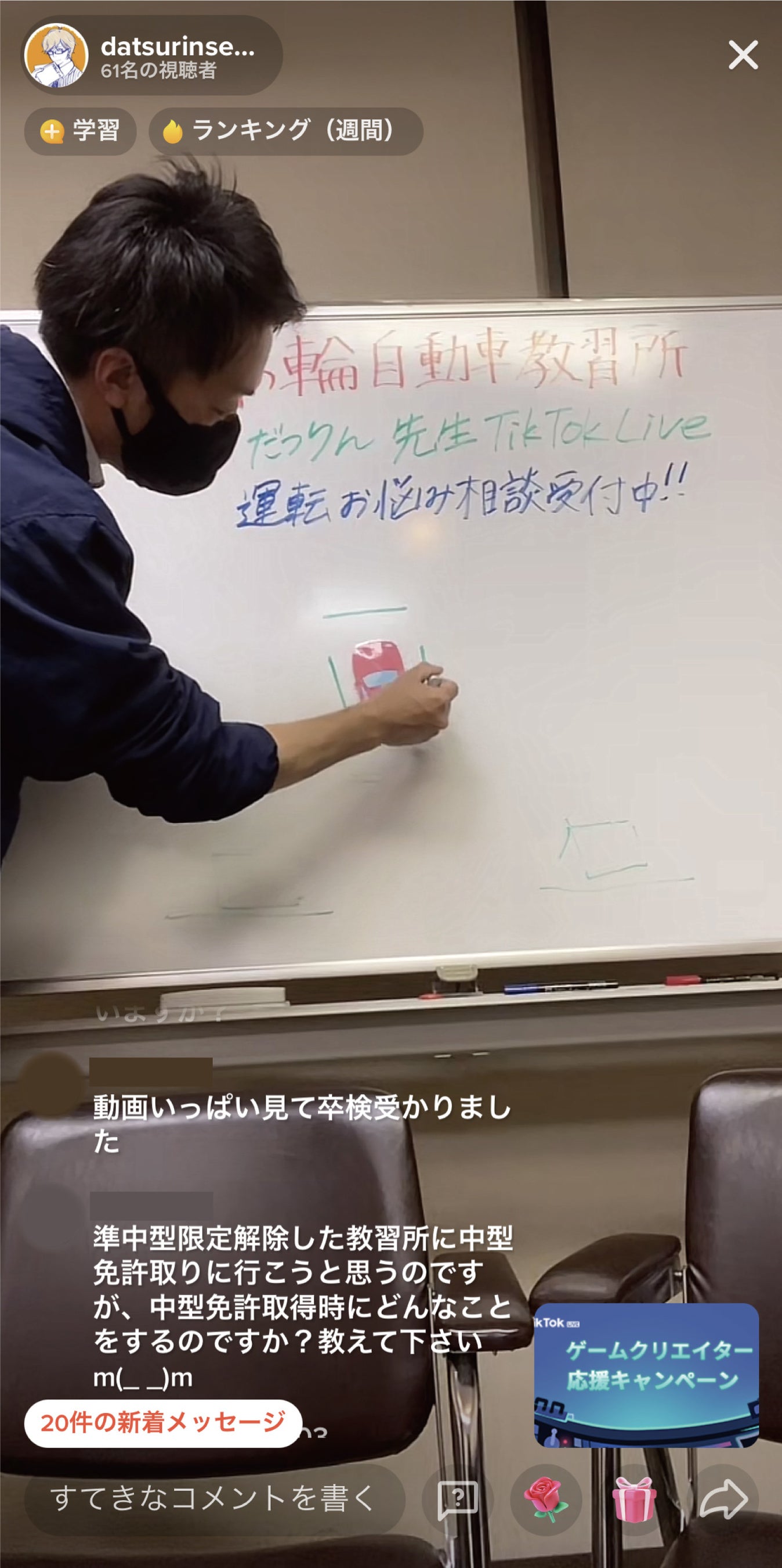 毎週金曜18時頃より「TikTok」でLIVE配信を行なっております。リアルタイムで、全国各地の現役教習生の悩み相談を受けたり、運転する上でのコツをアドバイスするなどの取り組みです。今では、常時60~80名、最大同時接続人数は150人を超えるようになりました。
