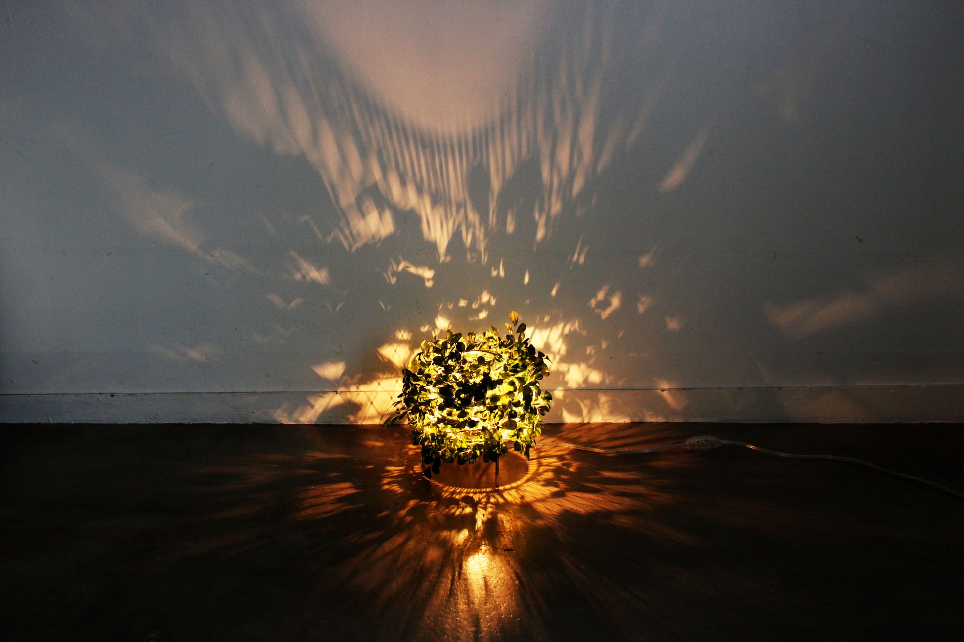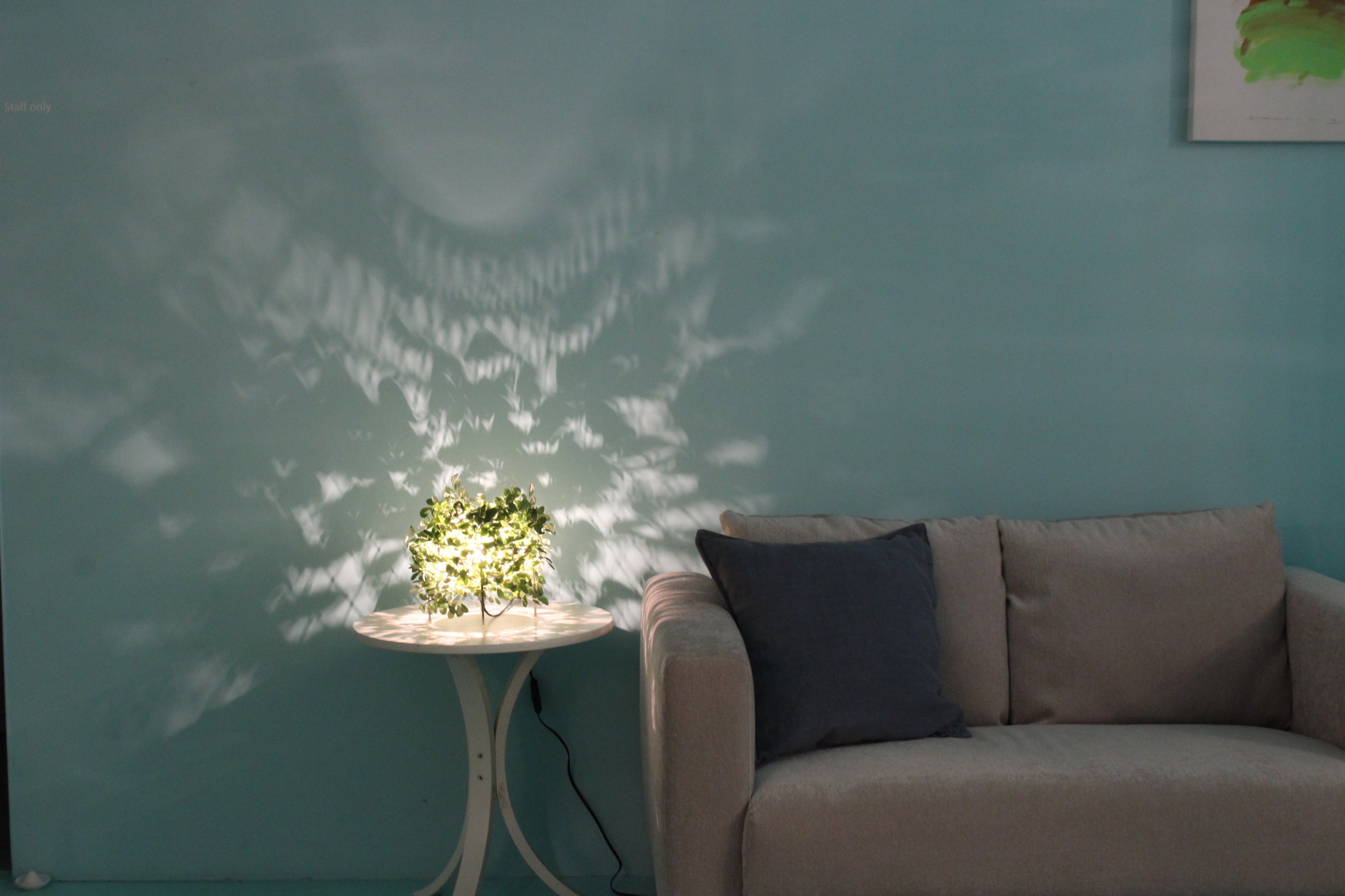 点灯すると、アーティフィシャルグリーンから心やすらぐオレンジ色の光が灯り、まるで穏やかな木漏れ日のよう。壁に葉っぱの影が映し出されて、光と影の演出で心地よく過ごせます。また、点灯をしていない日中も爽やかなグリーンがお部屋のアクセントに。