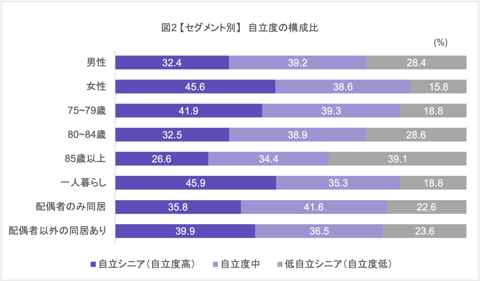 自立シニアをセグメント別に見ると、性別では「女性」が高い(「男性」比+13.2%)結果でした。年齢別では、年齢が上がるほど自立シニアの構成は下がるものの、「85歳以上」でも26.6%が該当しました。同居家族別では「一人暮らし」でもっとも自立シニアの構成が高くなりました。