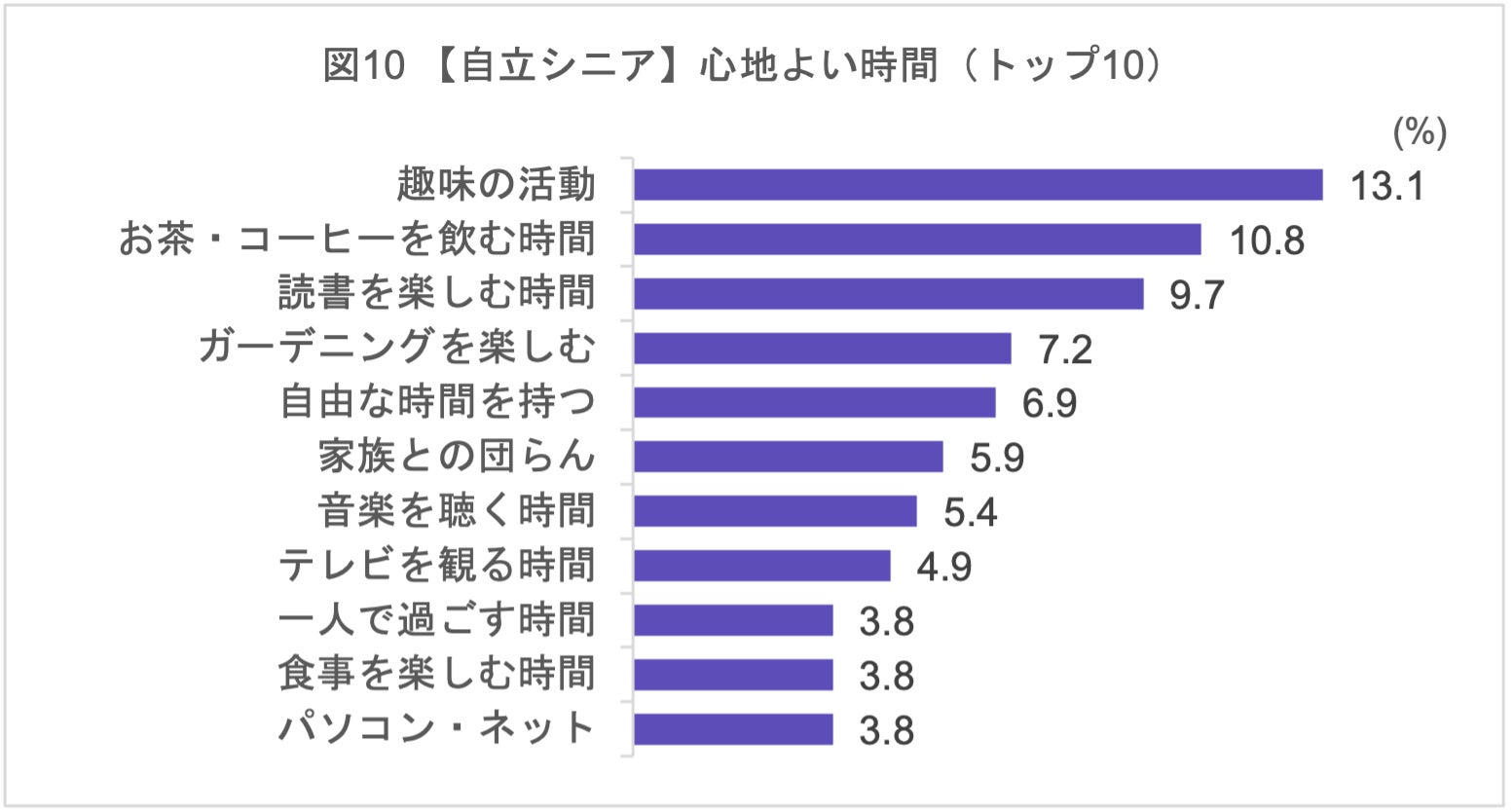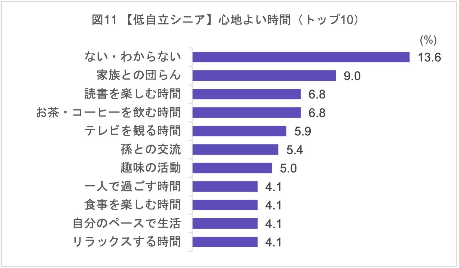 自分にとって「心地よい時間」はどのようなものかを尋ねたところ、自立シニアは「趣味の活動」「お茶・コーヒーを飲む時間」「読書を楽しむ時間」が上位に上がりました。趣味や読書など「自分を楽しませる時間」をもっていることがわかりました。また、自立シニアは「ない・わからない」が上位に入らないことからも、自ら気持ちを整え自分を楽しませる暮らしをしている人が多い様子がうかがえました。