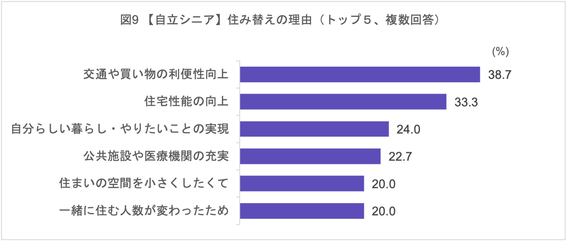 ・自立シニアの住み替え理由は「交通や買い物の利便性向上」(38.7%)、「住宅性能の向上」(33.3%)、「自分らしい暮らしや、やりたいことの実現」(24.0%)。
