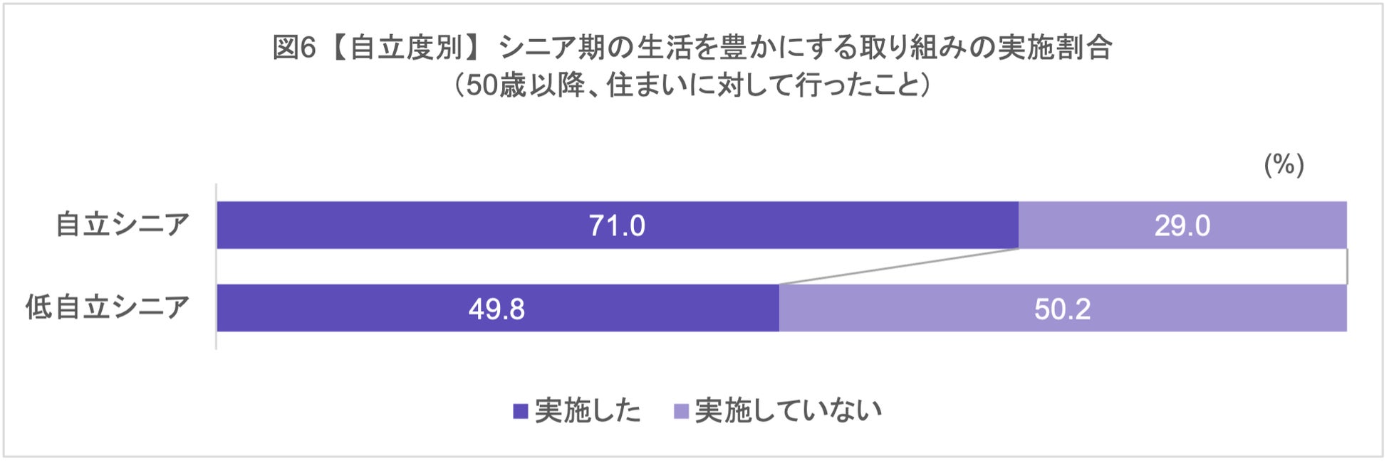50歳以降、シニア期の生活を豊かなものにするために住まいに対して取り組みを実施した自立シニアは71.0%にのぼりました。一方で、低自立シニアでは49.8%にとどまりました。