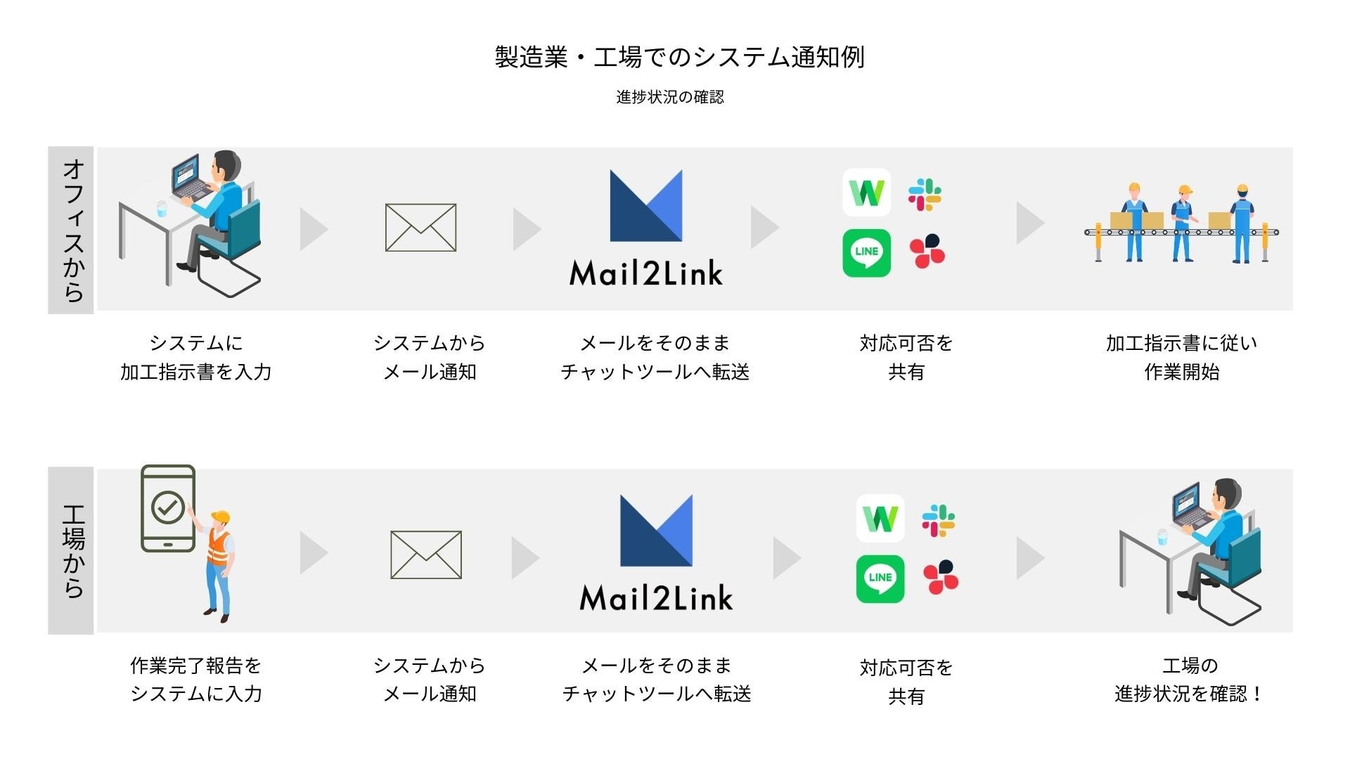 Mail2Linkでメールをチャットツールに転送することで、工場稼働状況を可視化できたり、オフィスと工場との連携強化を実現します。