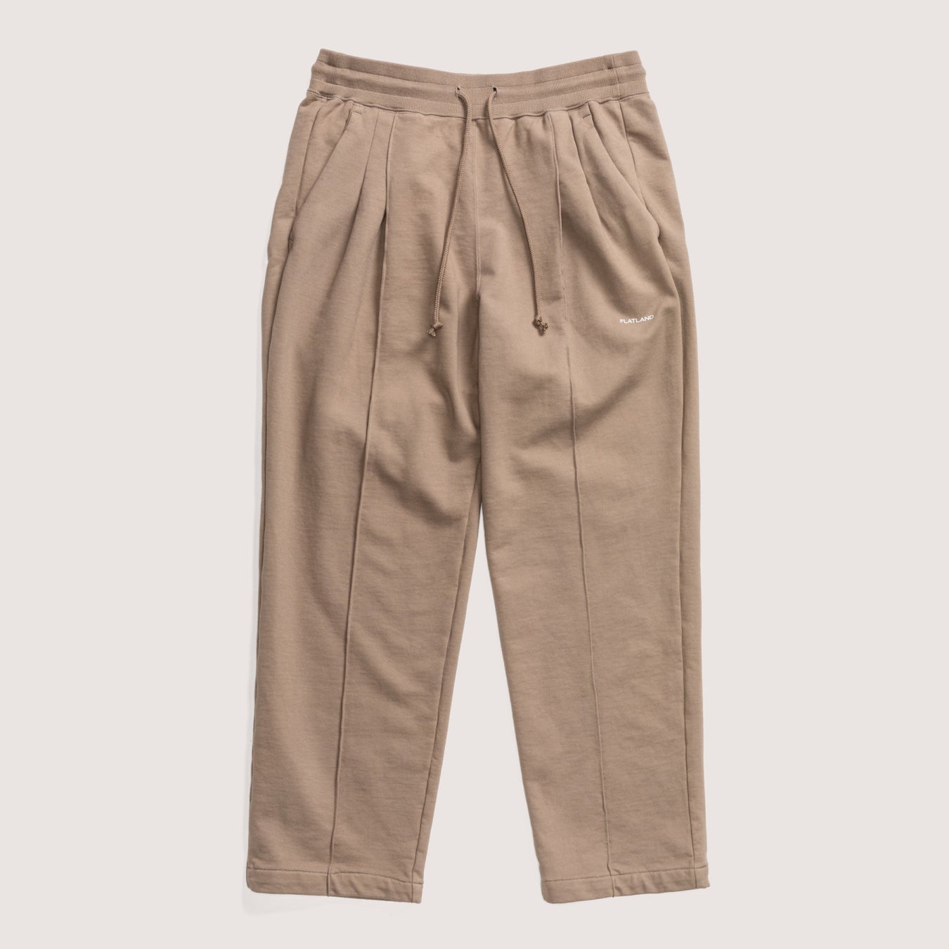パンツにはあえてスラックスのパターンを採用し、さりげなくテーパードなラインやセンタープレス風に見えるタックなど、カジュアル過ぎないシルエットとエレガントな遊び心がポイント。