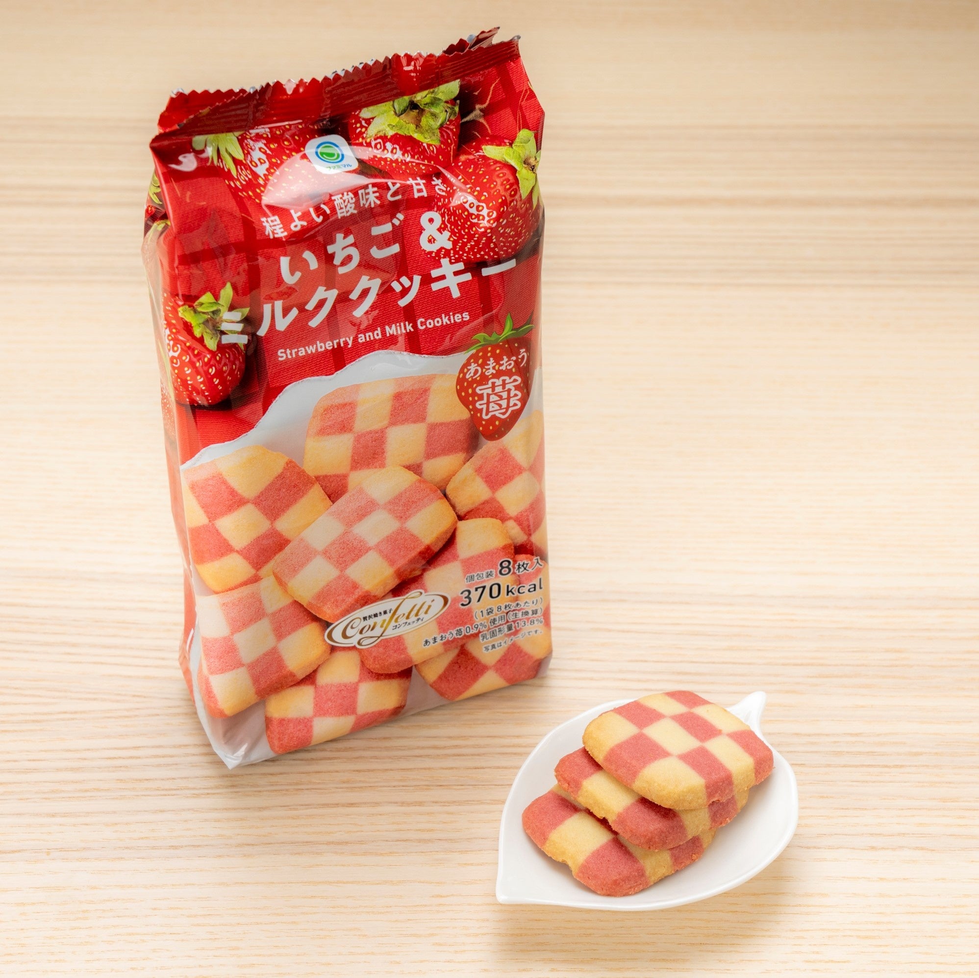 【内容】あまおういちごパウダーを練り込んだいちご味クッキーとミルク味のプレーンクッキーの2種類の味わいで、1枚でいちごミルク風味を楽しめます。