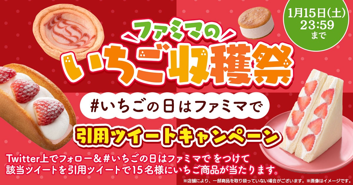 1月15日「いちごの日」を記念し、1月15日(土)限定でTwitter上でフォロー&「#いちごの日はファミマで」をつけて該当ツイートを引用ツイートすると、抽選で15名様にいちご商品が当たるキャンペーンを実施いたします。