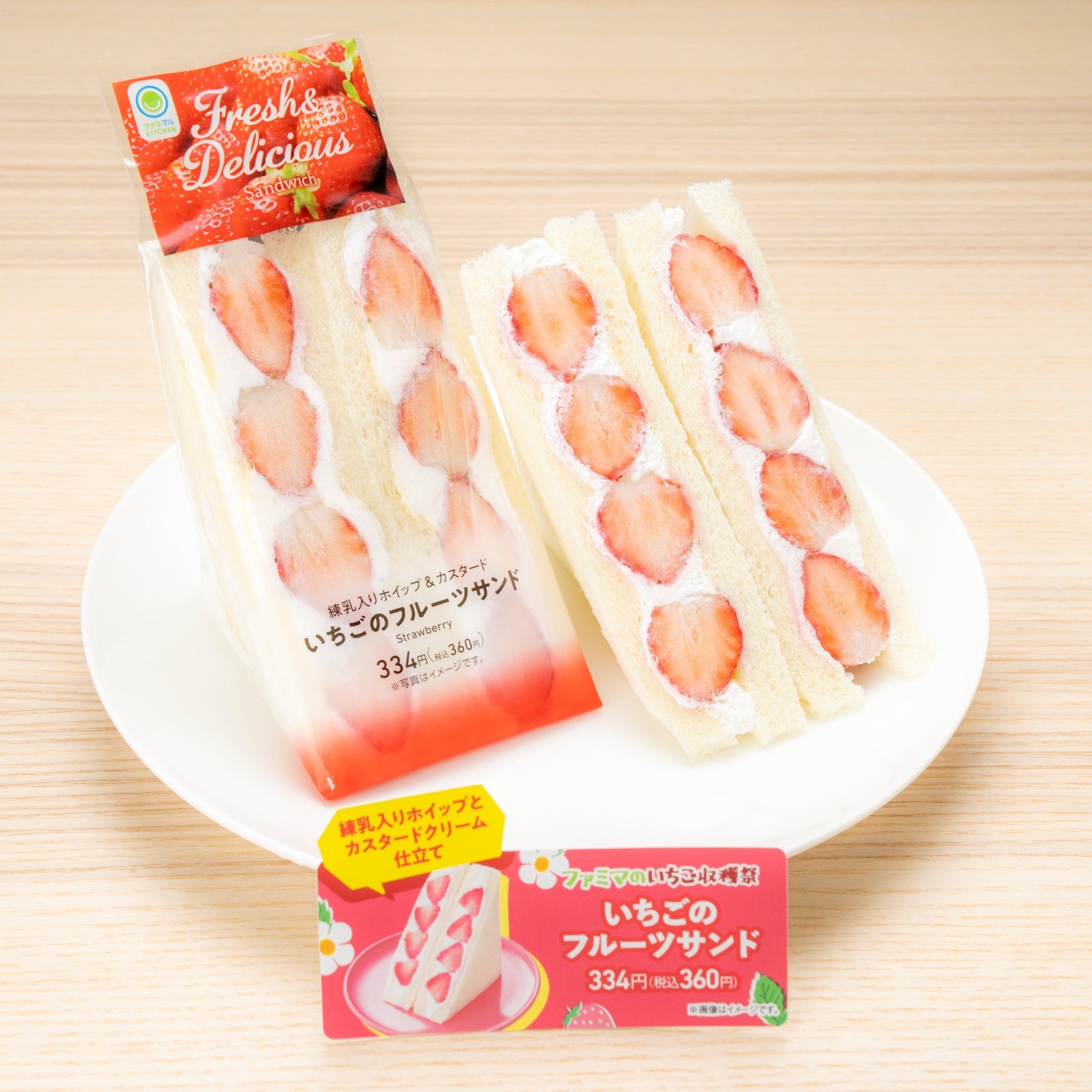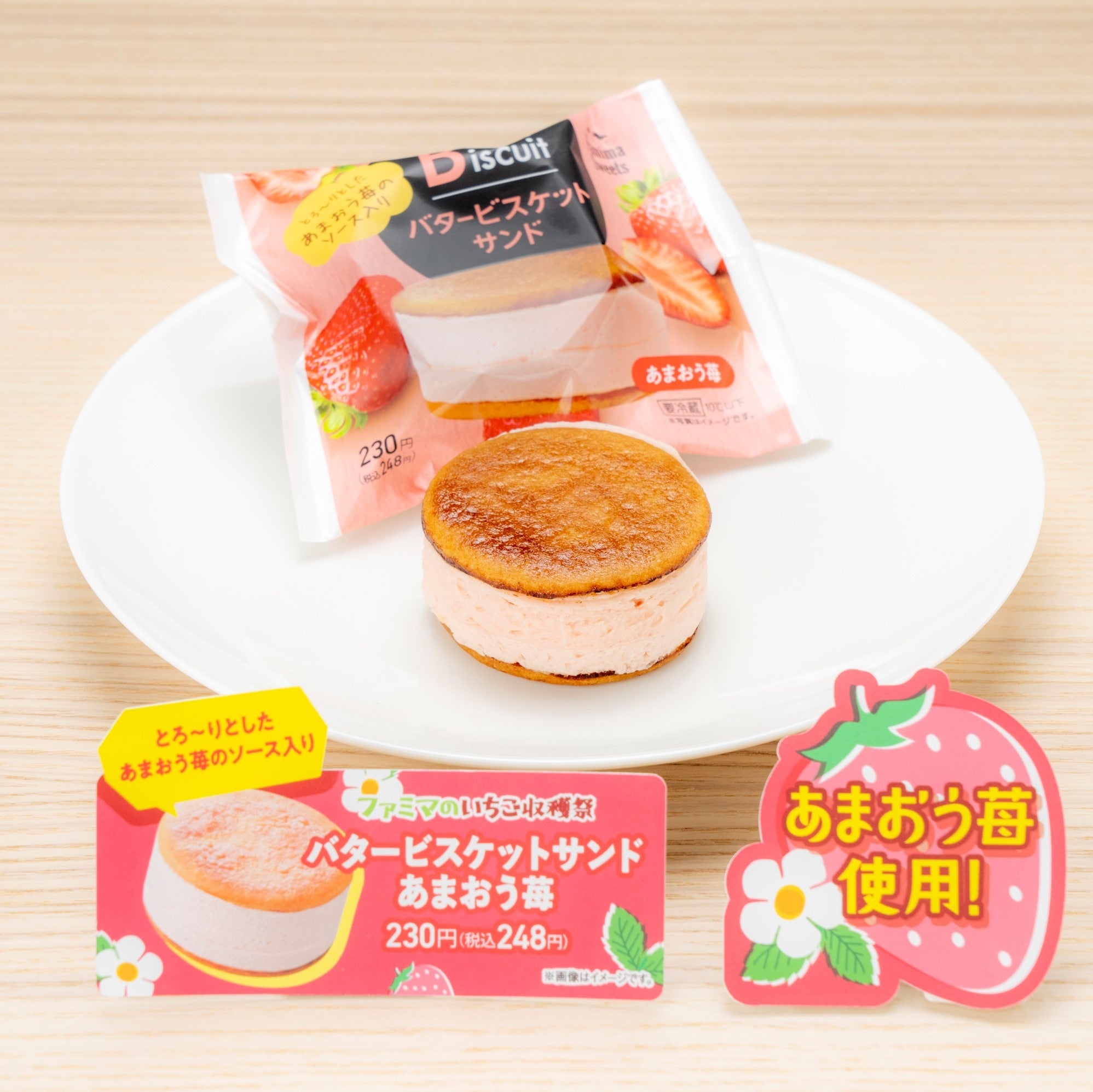 「ファミマのいちご収穫祭」では、累計販売2,000万食を突破した人気商品バタービスケットサンドの限定いちご味「バタービスケットサンドあまおう苺」230円(税込248円)や「いちごのフルーツサンド」334円(税込360円)、「いちごミルク」230円(税込248円)など、いちごの甘酸っぱさや、つぶつぶ食感を存分に楽しめる限定商品を全18種類のラインナップでご用意いたしました。