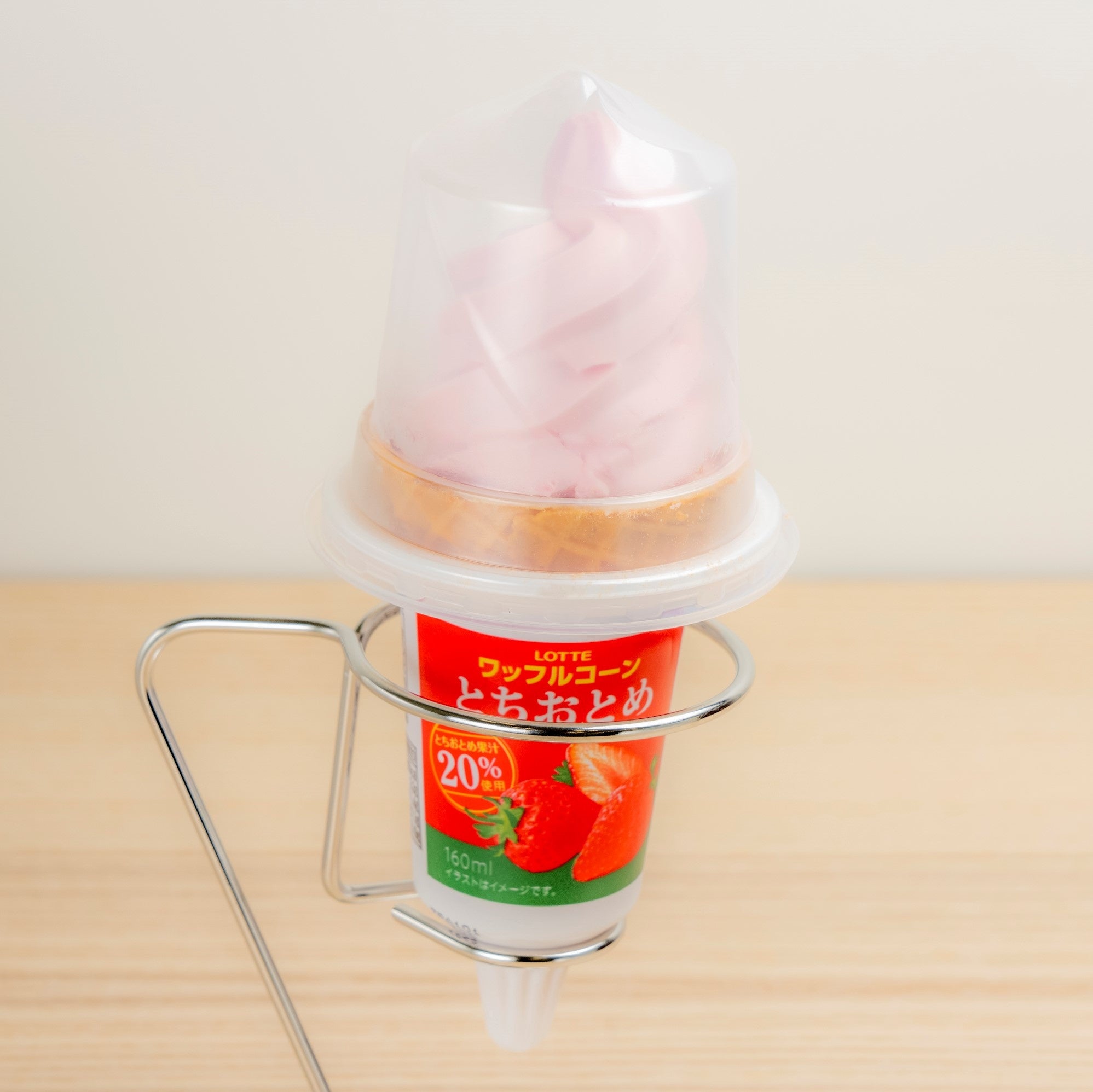 【内容】国産のとちおとめ果汁を使用した優しい甘さのいちごアイスと、小麦粉の一部に全粒粉を使用した香ばしいシュガーコーンを楽しめる、ワッフルコーンアイスです。