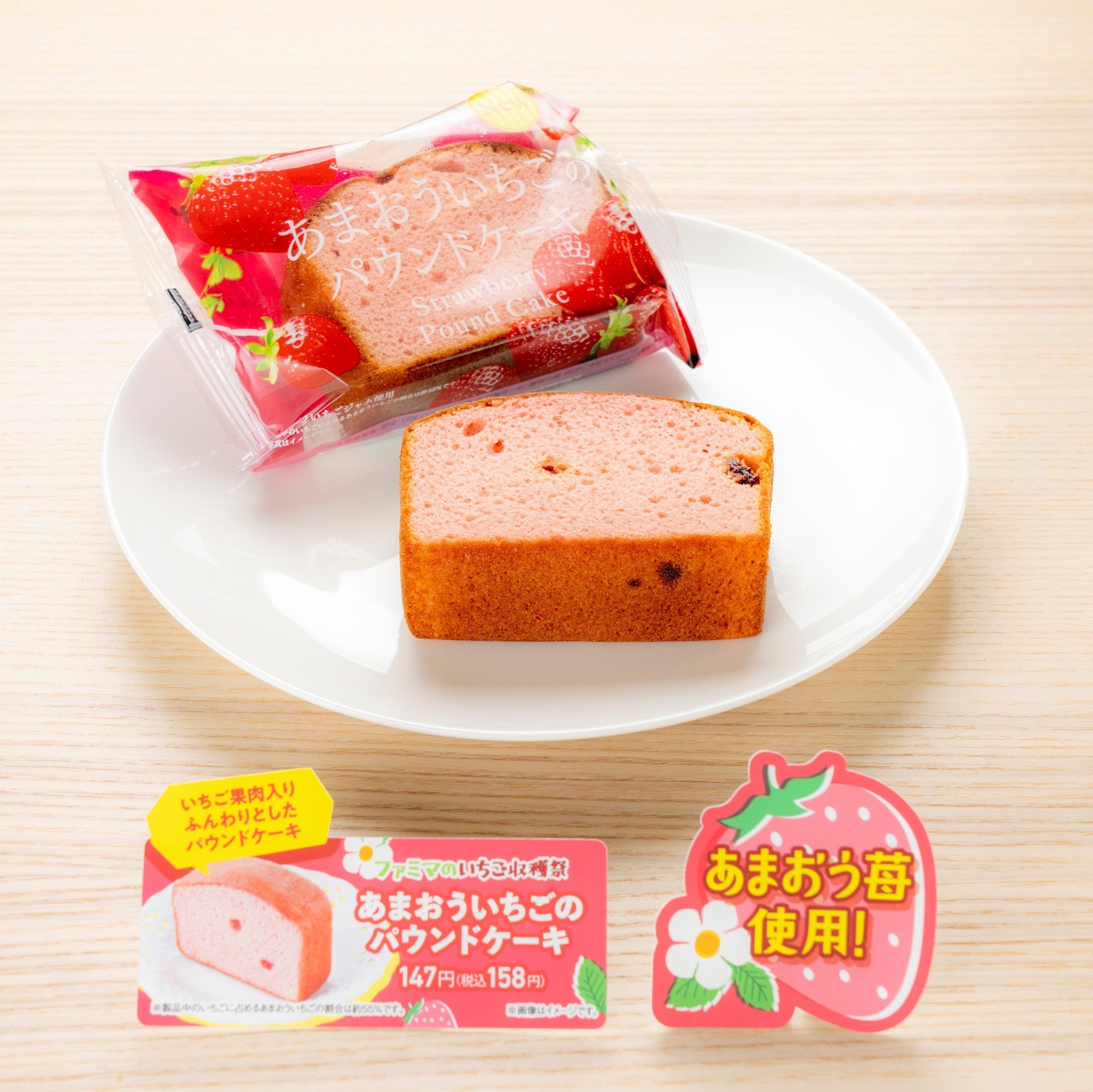 【内容】あまおういちごジャムを使用したふんわり食感のパウンドケーキです。いちご果肉を練りこむことでいちごの食感や甘酸っぱさを表現いたしました。