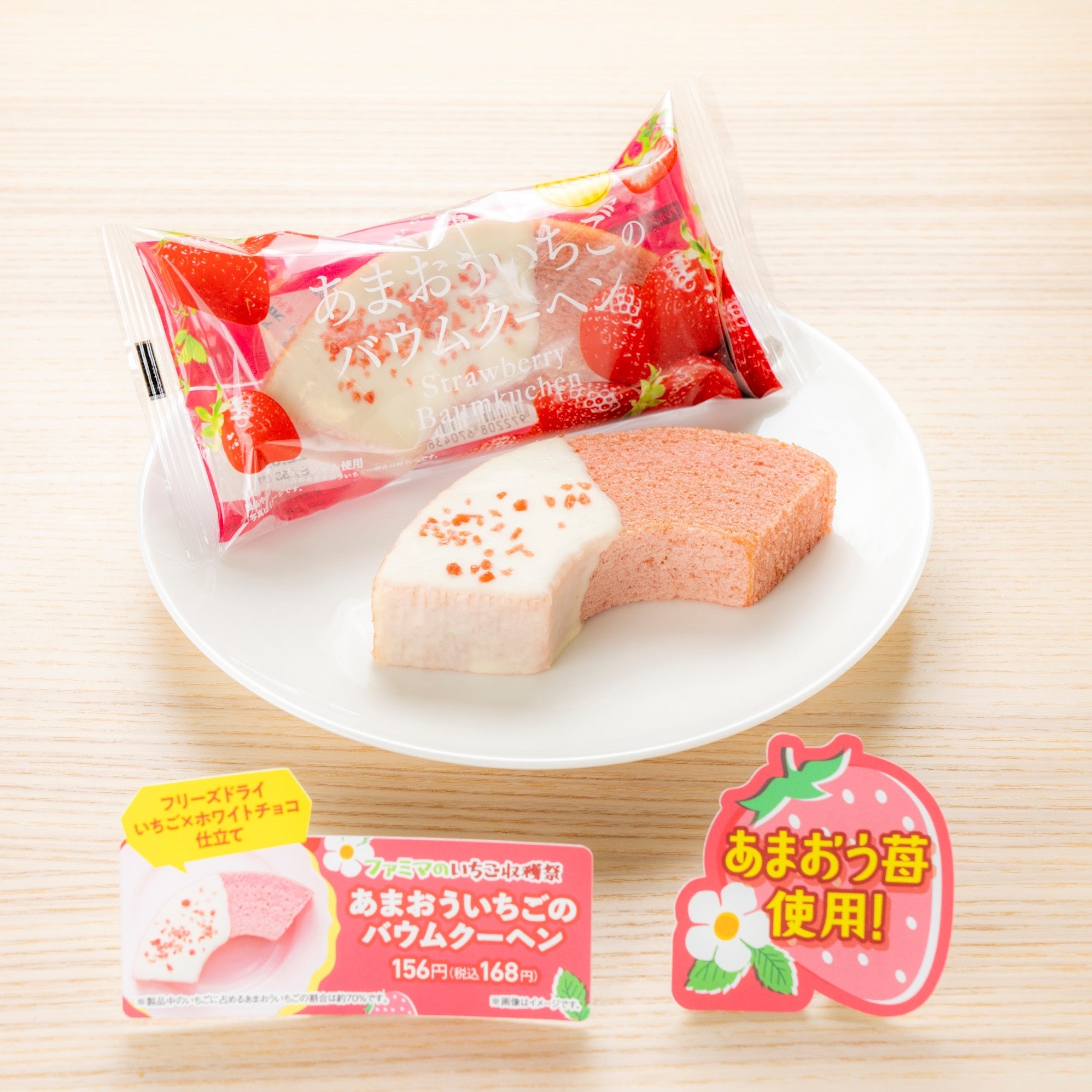 【内容】あまおういちごジャムを生地に練りこんだバウムクーヘンにホワイトチョコとフリーズドライのいちごをトッピングしました。
