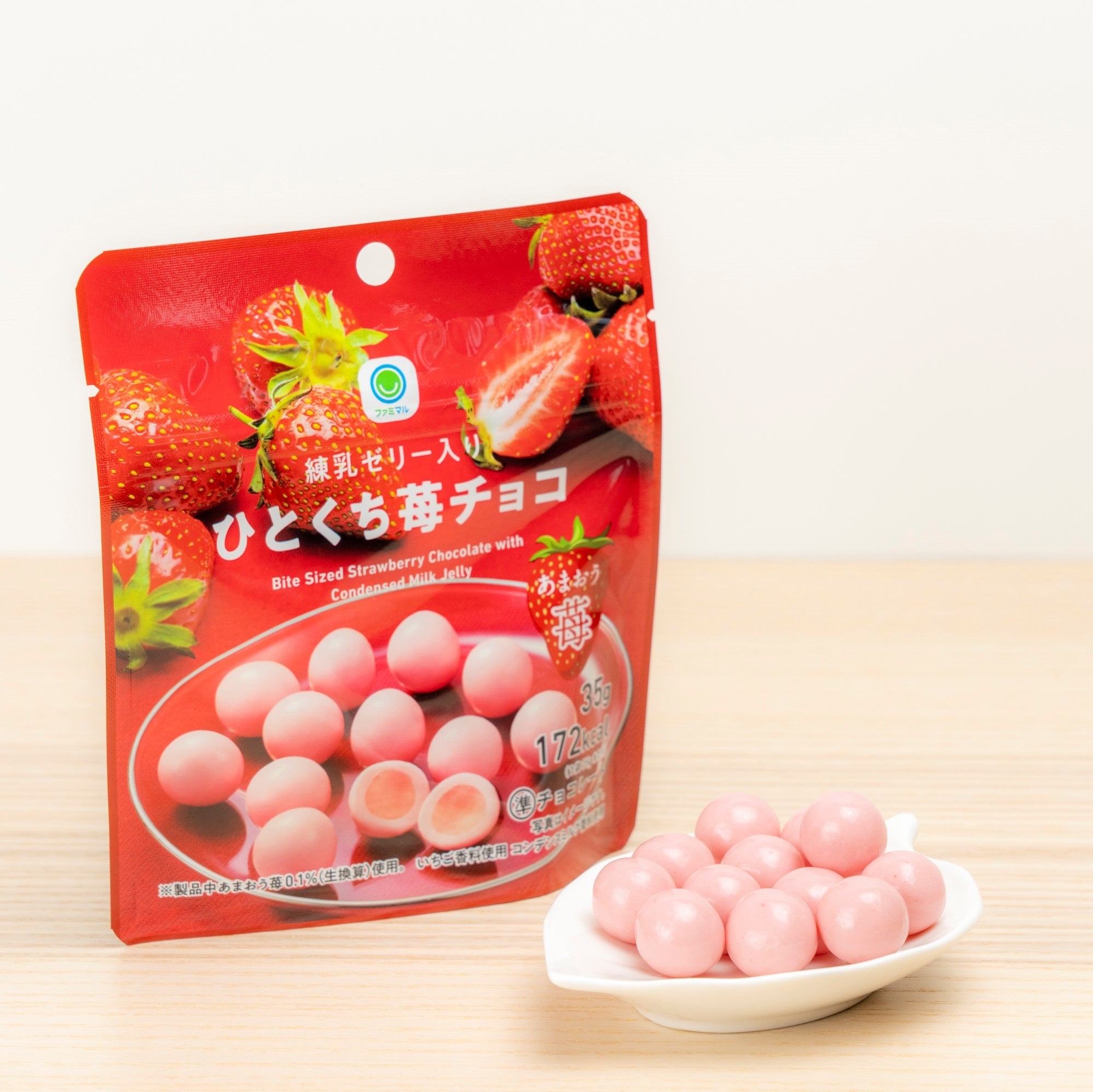【内容】練乳風味のひとくちゼリーをあまおういちごのチョコレートで包みました。いちごミルク風味を楽しめる、ひとくちサイズのチョコレートです。