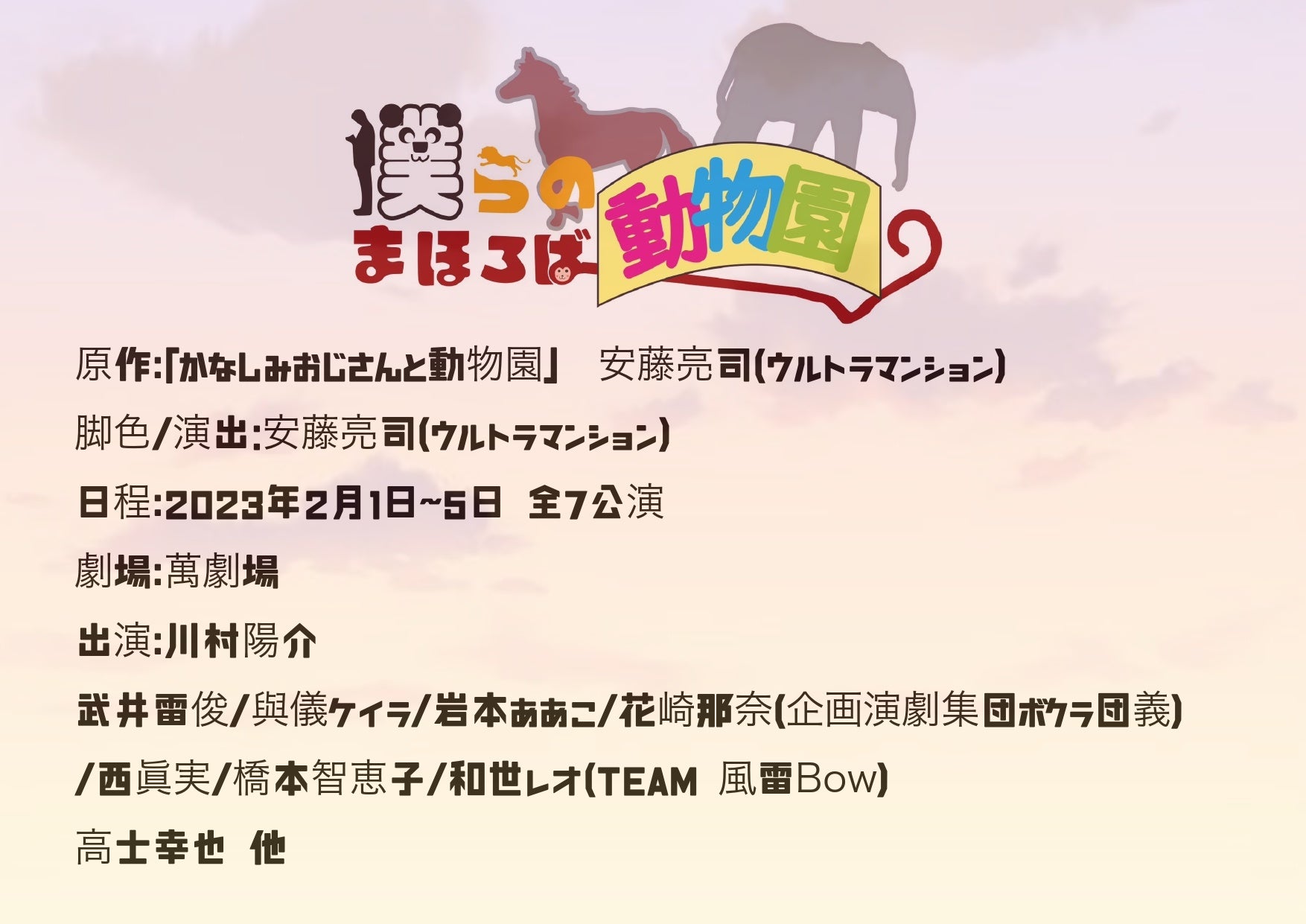 2023年2月1日(水)〜2月5日(日)、萬劇場にて、舞台「僕らのまほろば動物園」(主催:株式会社あるひ)の公演を行います。