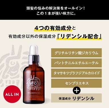 医薬部外品の育毛剤 「WILDERMAN」は4つの有効成分と有効成分以外の保湿成分リデンシルを配合、 抜け毛や毛髪のボリュームダウンの3つの原因にアプローチします。