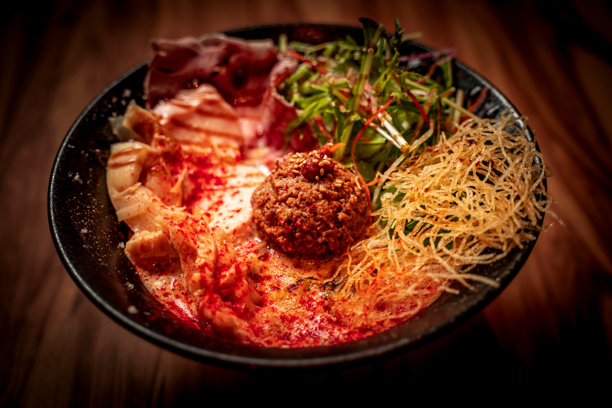 トッピングの肉味噌は、肉感を感じられるように豚肉を粗めに挽いたミンチに、すりごま、豆板醤、ニンニクで味付けし、さらに鯛のダシを加えた鯛の風味が香る、旨辛な肉味噌をお楽しみいただけます。