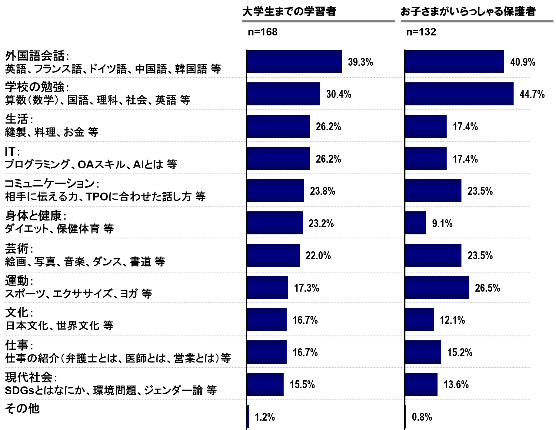 オンライン教育サービスで自身に身に付けたい、自身の子どもに身に付けたいカテゴリは、外国語会話や学校の勉強が3割~4割の回答率で、他のカテゴリと比較し、需要が高いことが分かりました。